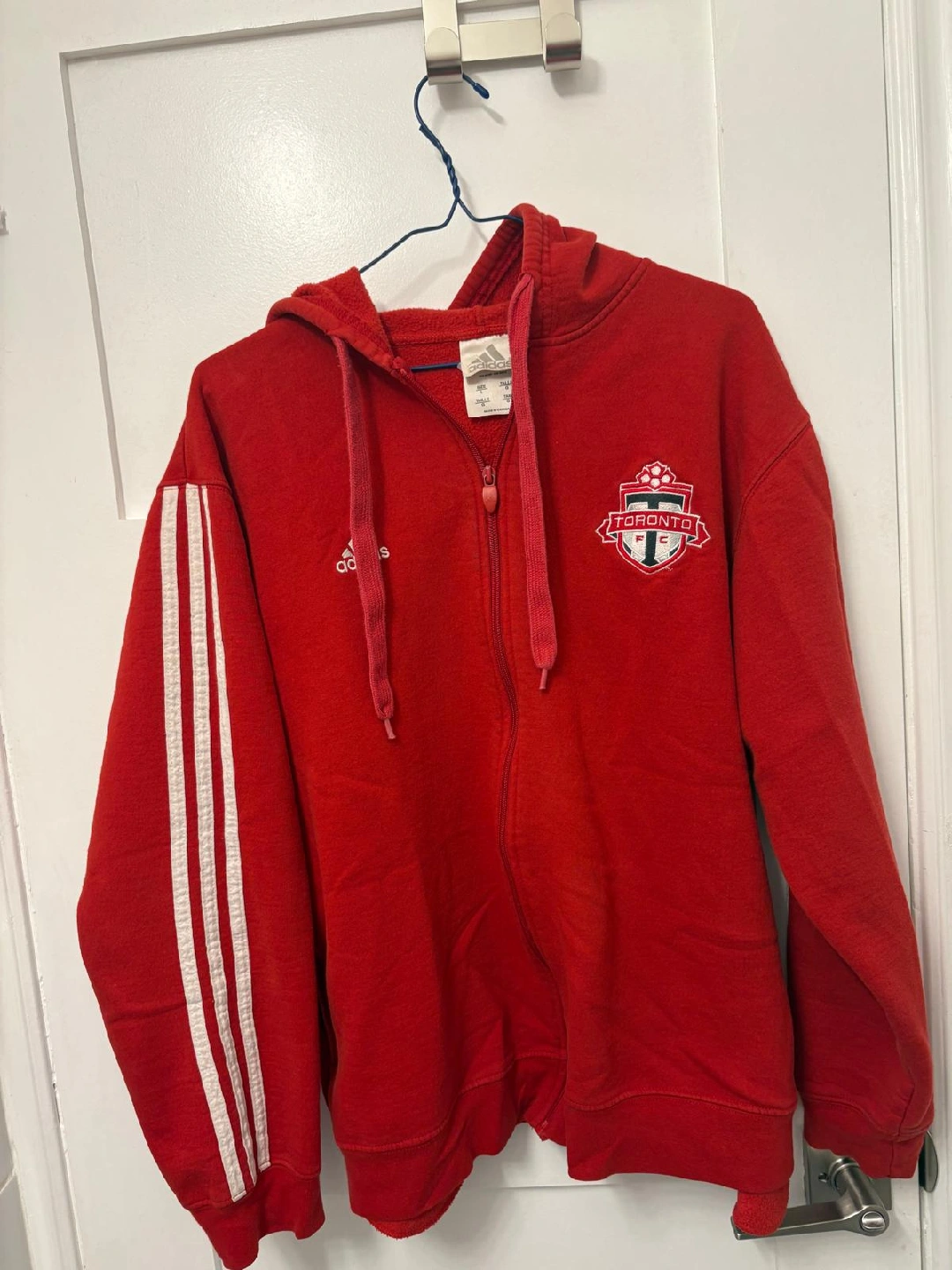 623Selling a red Adidas hoodie featuring the Toronto FC logo. It's a size large and has the classic Adidas three stripes on the sleeves. Made in Canada!