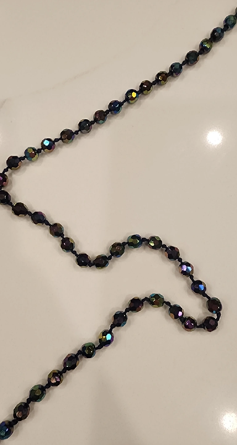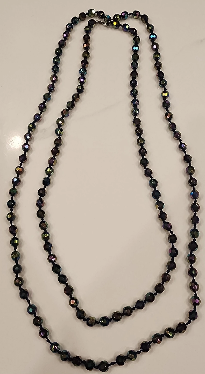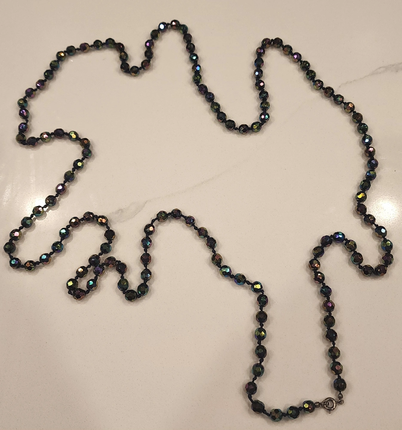 32Add a touch of retro glamour to your outfit with this stunning Carnival Glass necklace. Reflects coloura of pinks, greens and blues. Extended length is 53 inches.