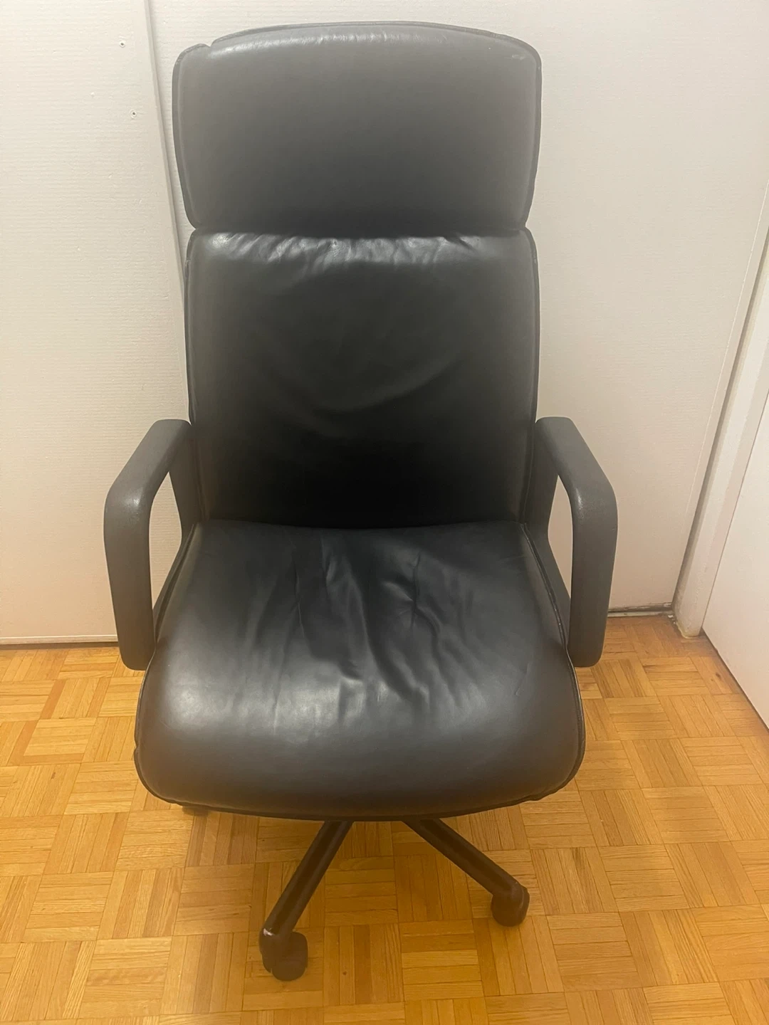 Selling a black leather executive office chair. It's in good condition and ready to provide comfortable support for your home office or workspace. Perfect for long hours of work or study!