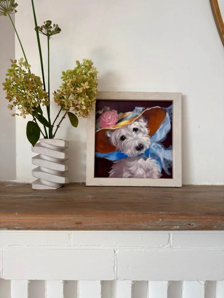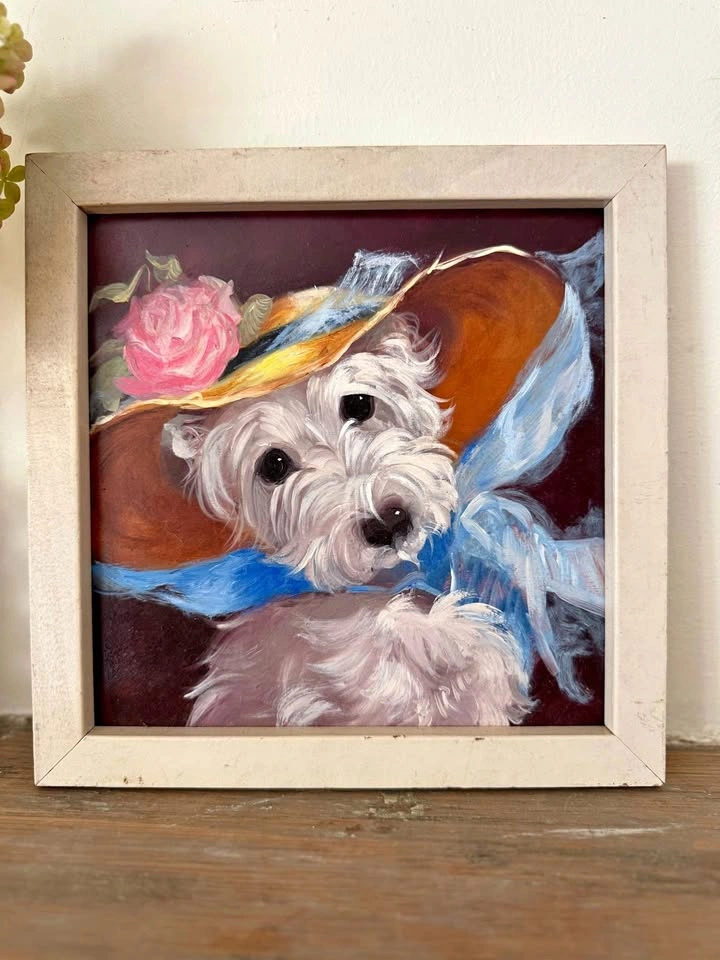 Charming vintage framed painting featuring a West Highland White Terrier (Westie).