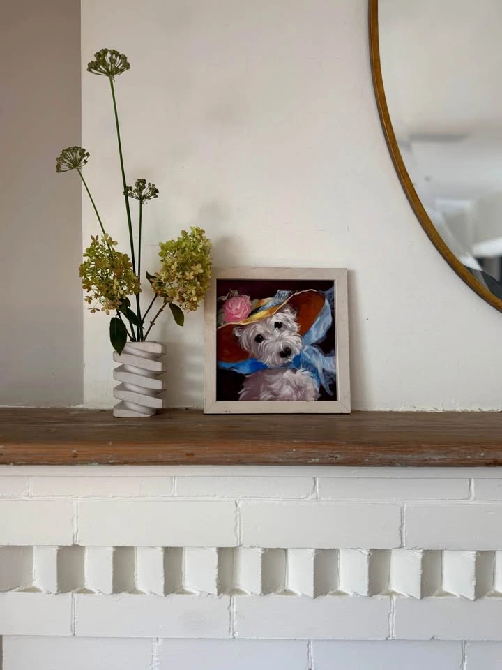 The little dog is dressed up in a brown hat with a pink rose and a blue ribbon bow, giving the piece a fun, vintage and cottagecore aesthetic. Perfect for a dog lover, gallery wall, or a unique gift.