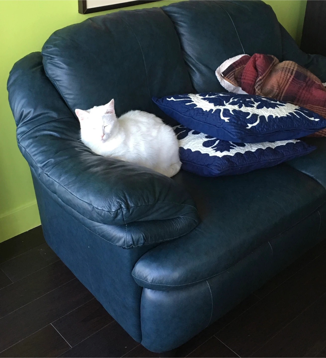 Gently used leather love seat, in navy blue.