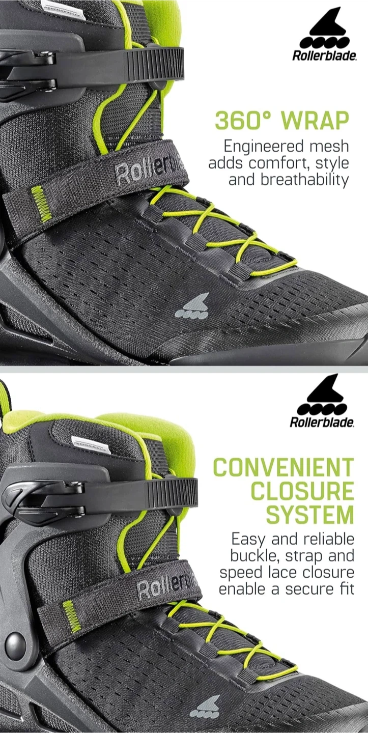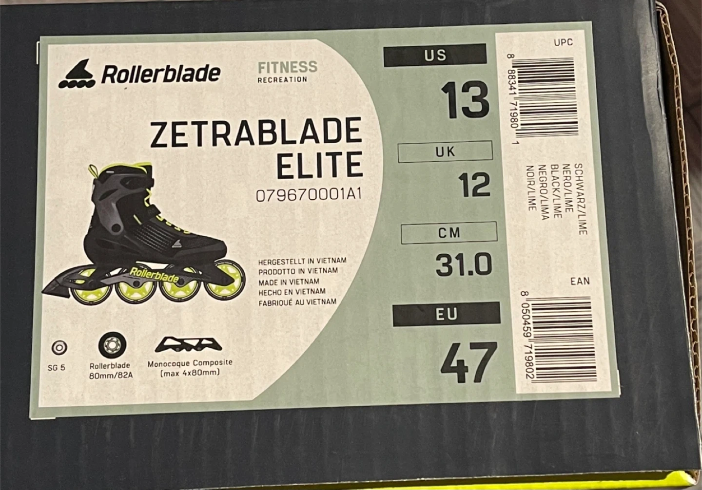 10Selling a pair of Rollerblade Zetablade Elite inline skates in US size 13. They come in the original box. These skates are black with lime green accents. The skates offer optimal support and comfort with a low balance structure for improved balance and control. The cushioned liner provides extra comfort. They also feature a convenient closure system with an easy and reliable buckle, strap, and speed lace closure for a secure fit. The wheel and bearing combination maintain the perfect blend of speed and control