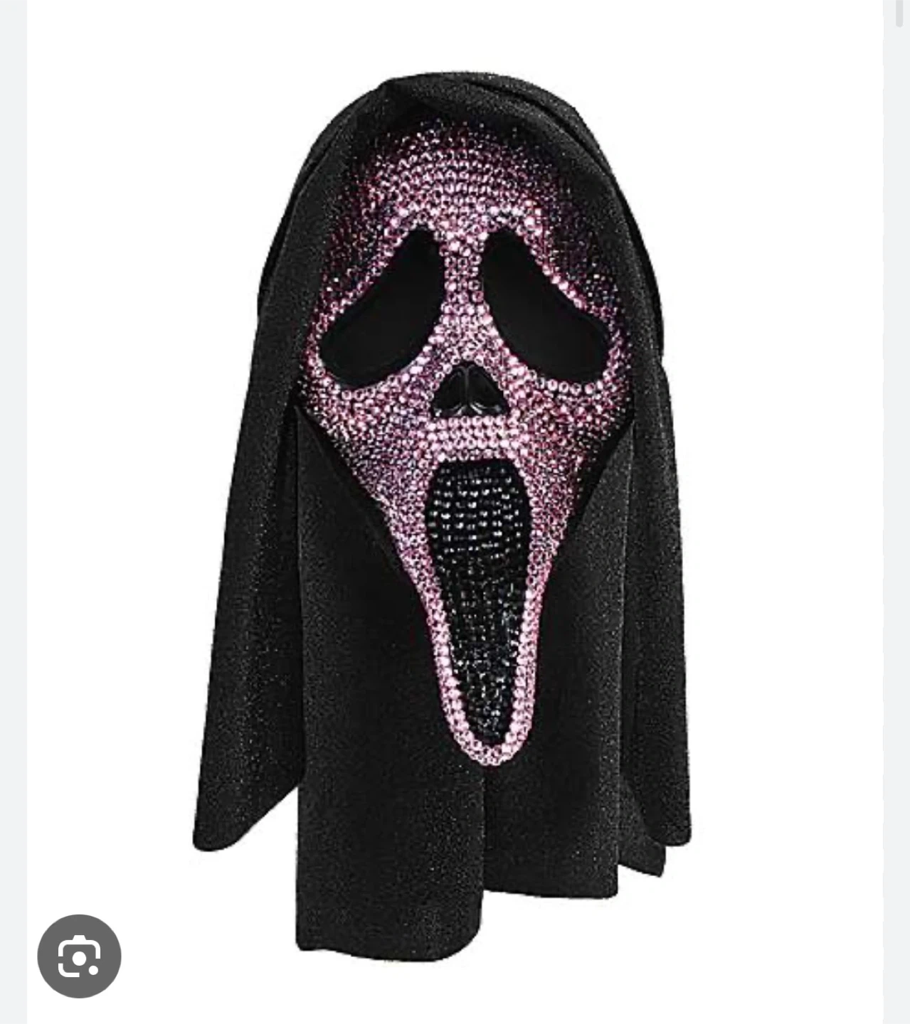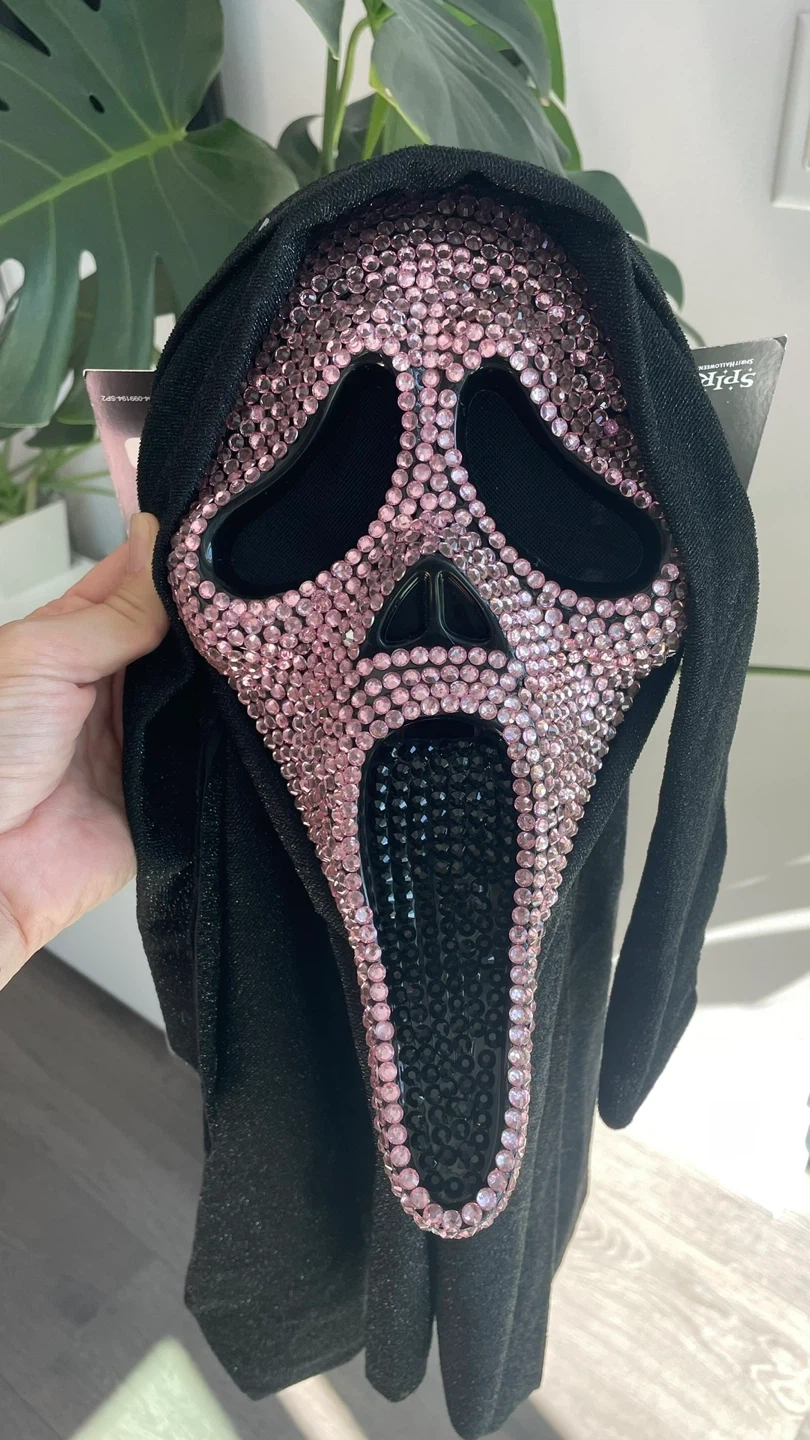 Selling a Ghostface mask that's sure to turn heads! This unique mask is adorned with sparkly pink details, giving it a fun and eye-catching look. Perfect for Halloween, costume parties, or just adding a bit of sparkle to your day