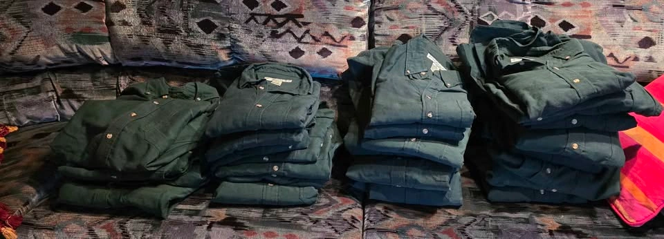 Purchased as a ‘staff uniform’, these are the leftovers that never got used. They are all brand new, but they have been washed as they have been sitting around in a box for a long time. I do not wish to iron them, but you probably will want to.