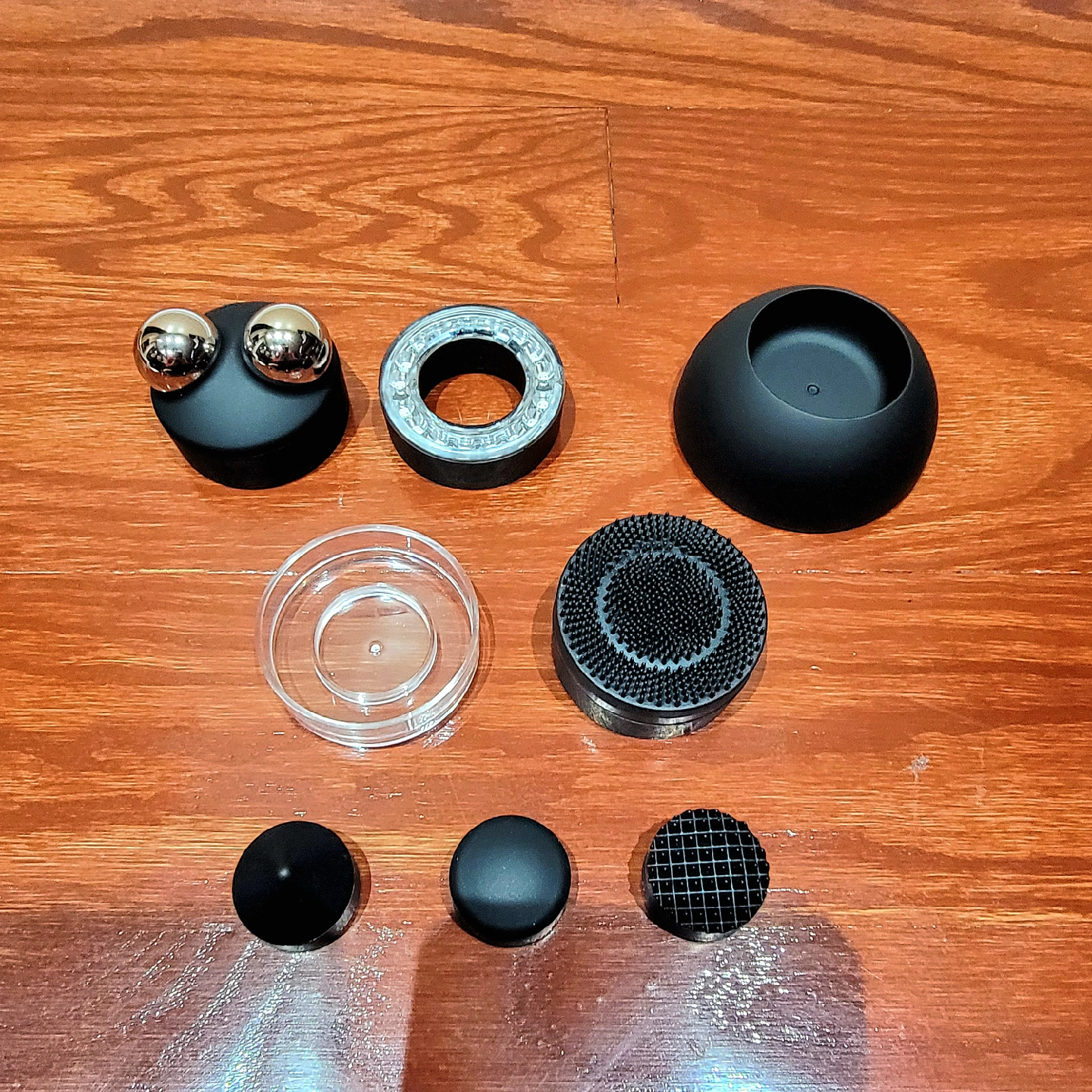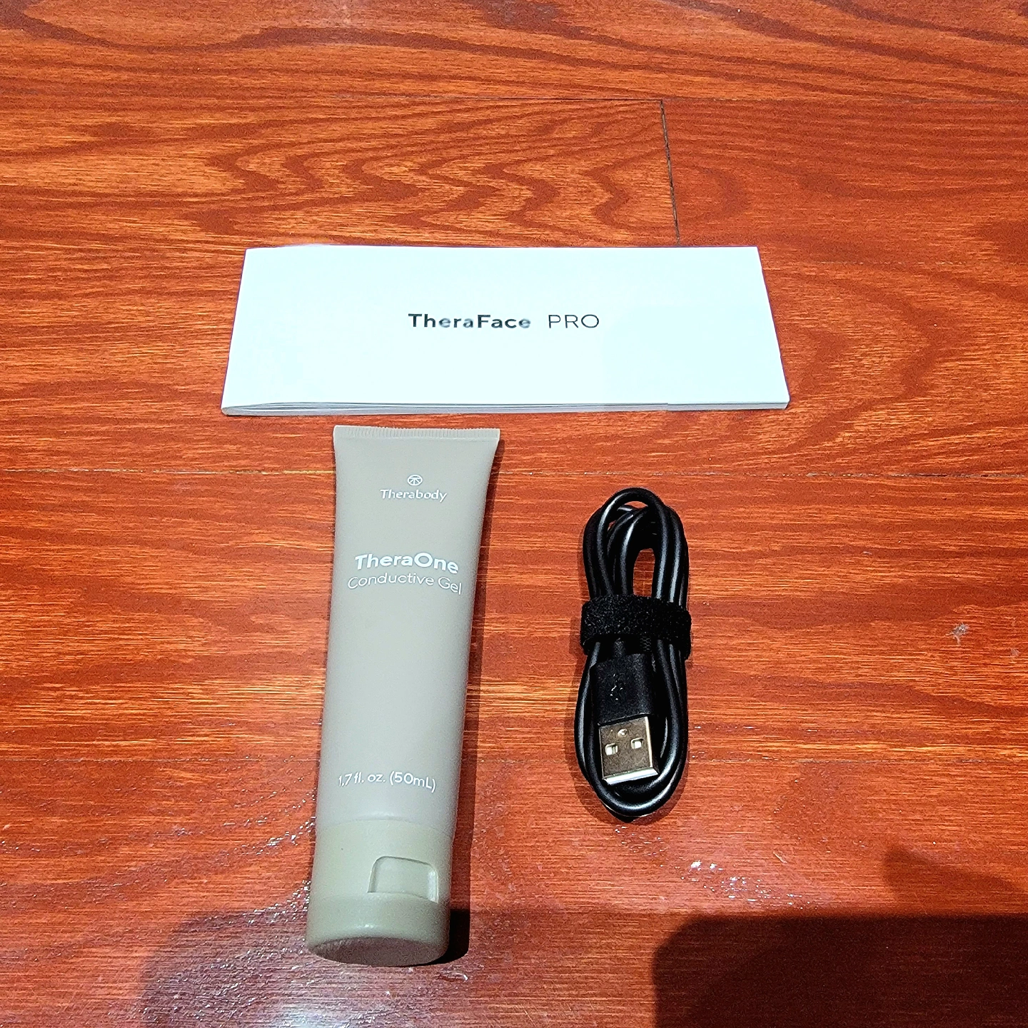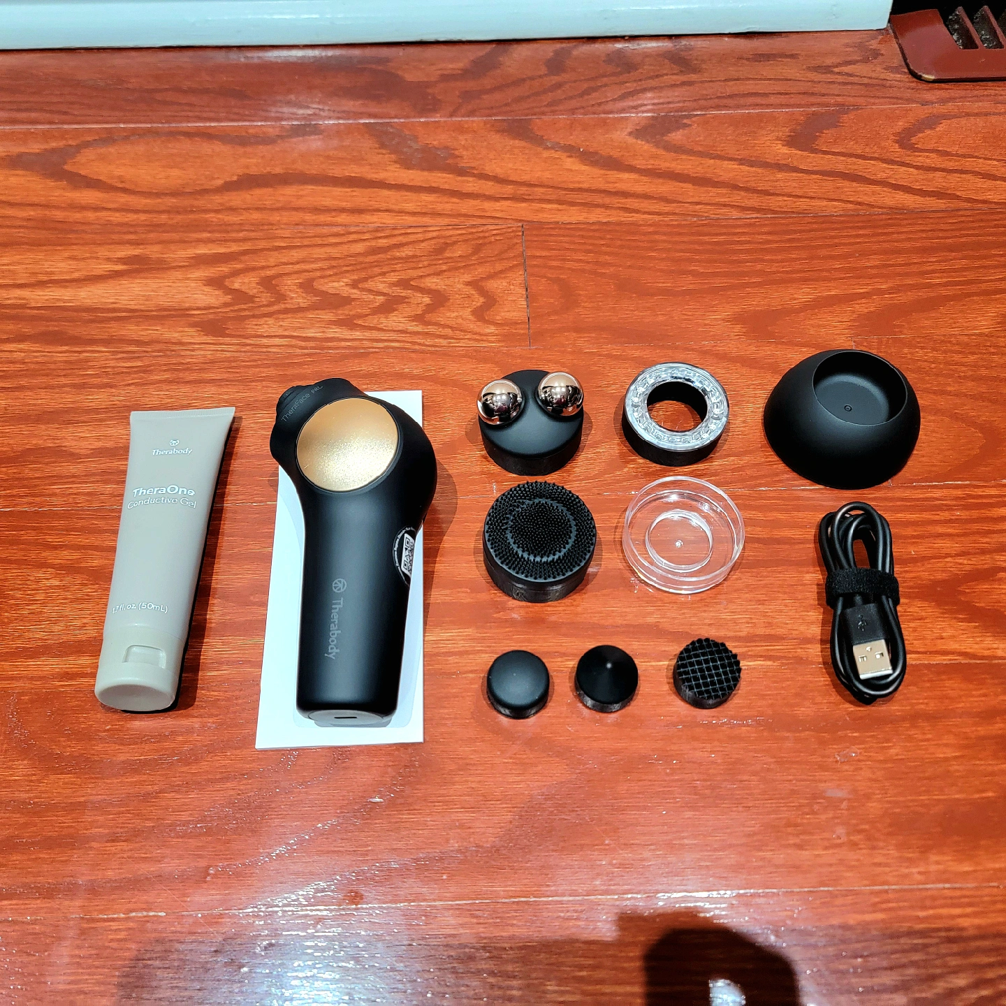 1 TheraFace PRO massage device, 3 percussive massage attachments (flat, cone, and mirco-point), 1 microcurrent ring attachment, 1 LED light ring attachment (has red light, blue light, and infrared light), 1 cleansing ring attachment, 1 conductive gel tube, 1 device stand, 1 portable case, 1 charging cable, and 1 user manual.