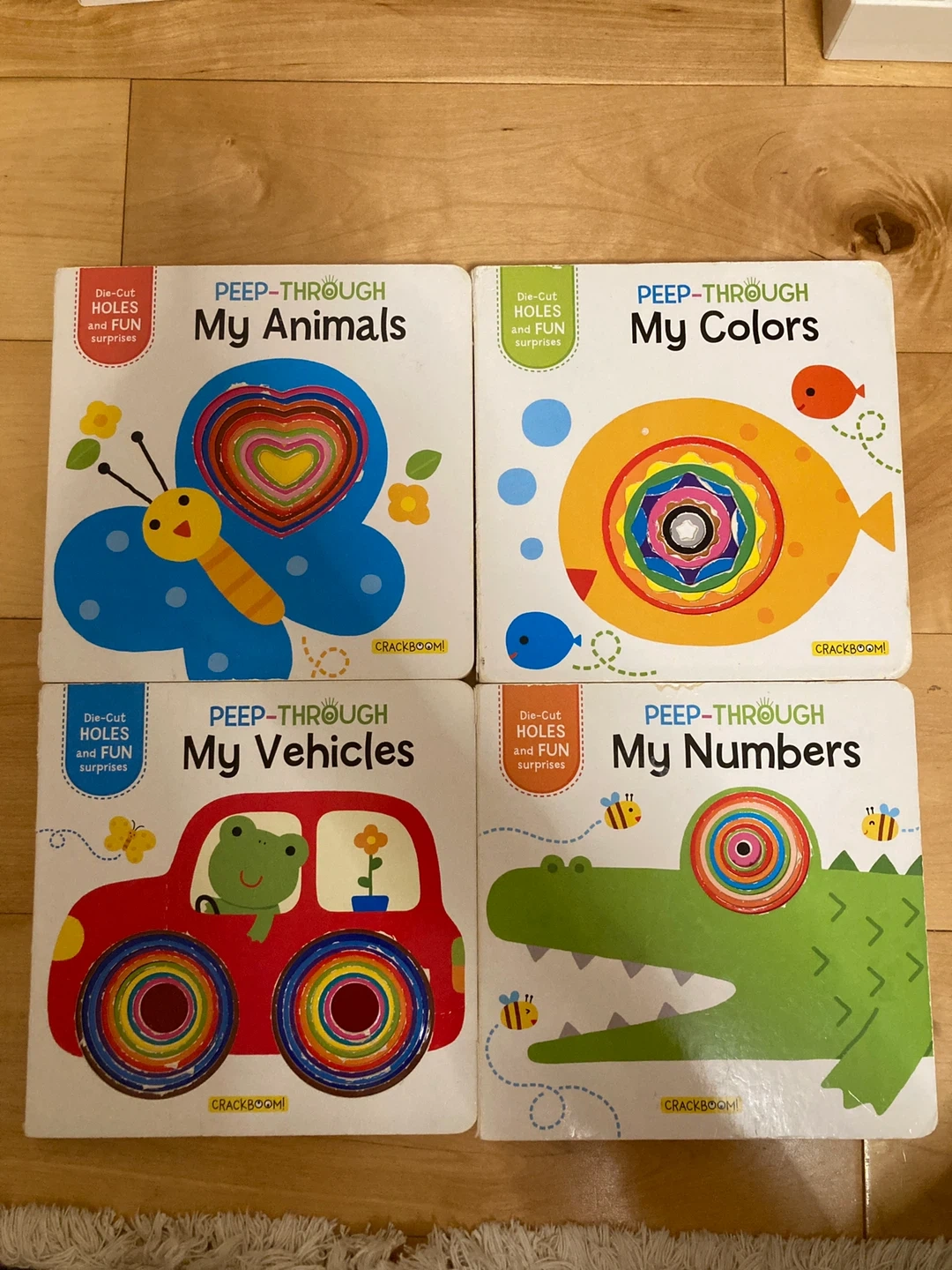 10Selling a set of four Crackboom! Peep-Through board books. These include 'My Animals', 'My Colors', 'My Vehicles', and 'My Numbers'. They feature die-cut holes and fun surprises on every page! Perfect for little ones to explore and learn
