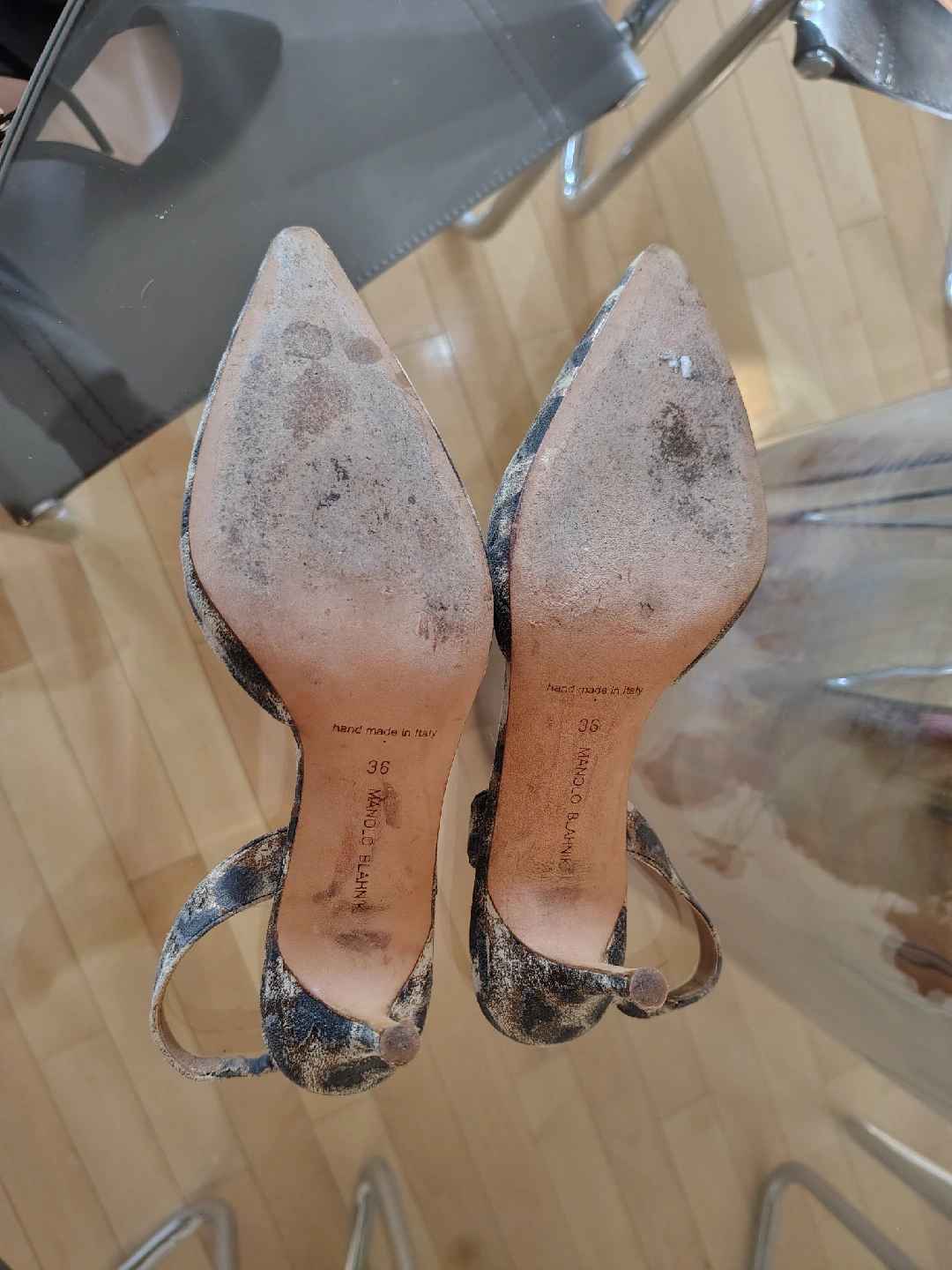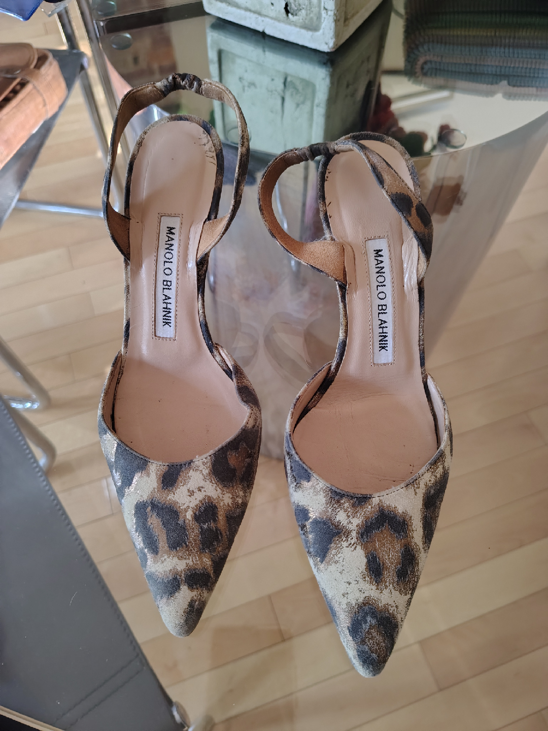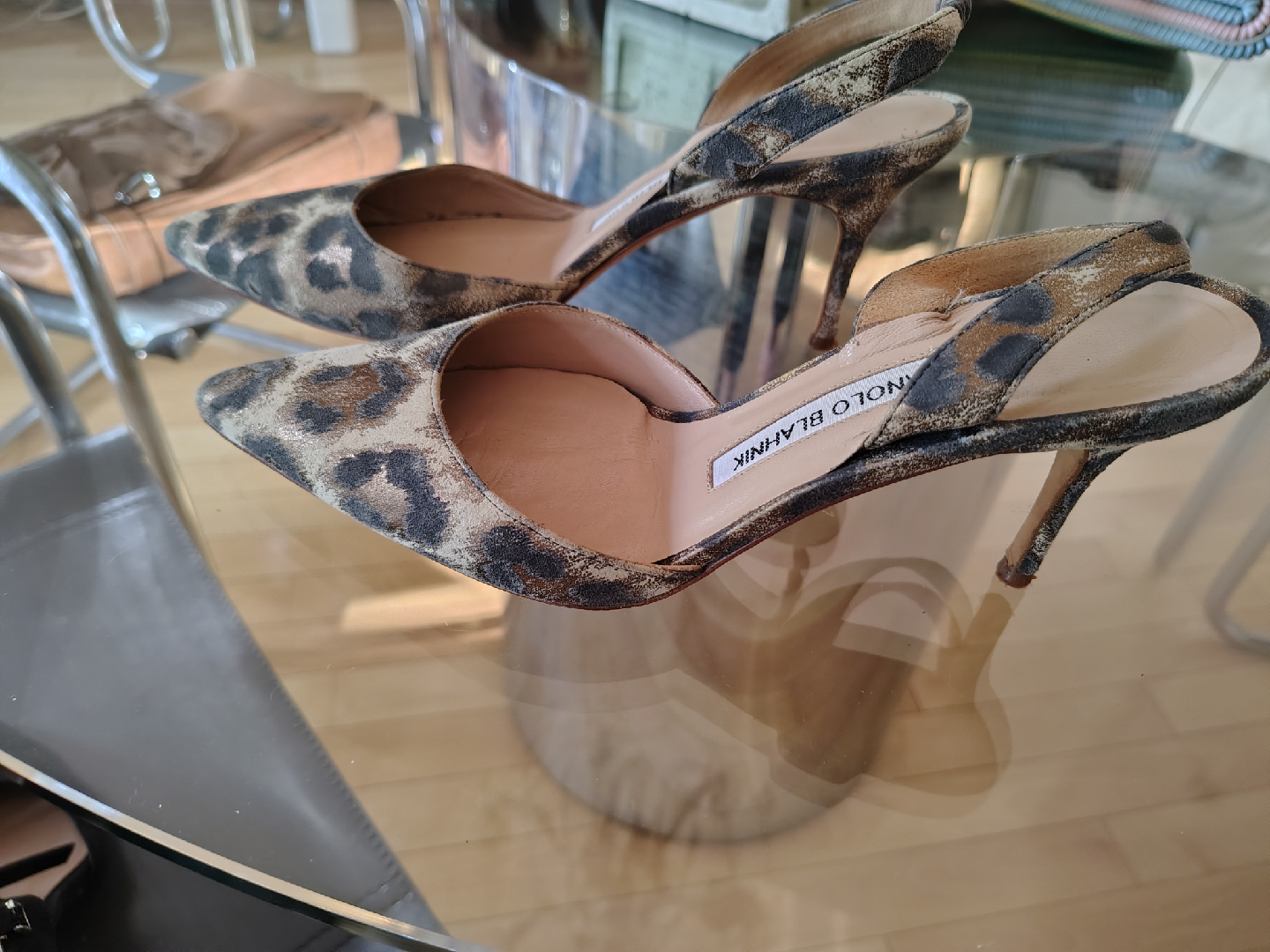 Selling a pair of authentic Manolo Blahnik slingbacks in a fabulous leopard print. These are a size 36. They fit like a 6 US. Please see photos for condition!