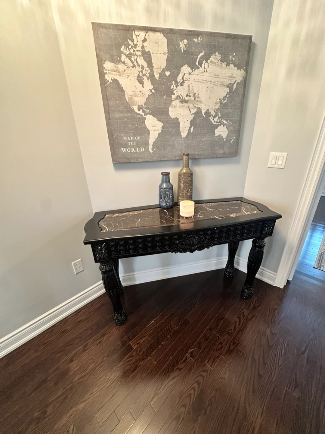10Selling a stylish black console table featuring a beautiful marble top. It's in great condition and would be a lovely addition to any entryway or living space. The table has ornate detailing on the legs and sides, adding a touch of elegance to its design