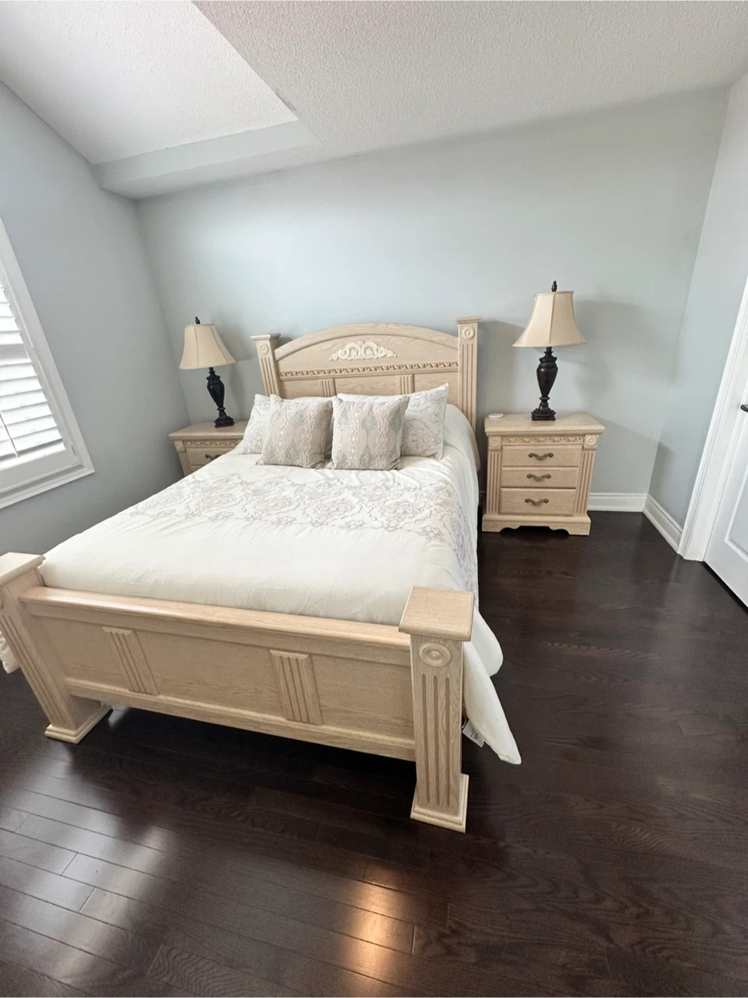 10Bedroom set with a bed, dresser, and two nightstands. The set is a light wood colour with intricate detailing. Perfect for adding a touch of elegance to your bedroom!