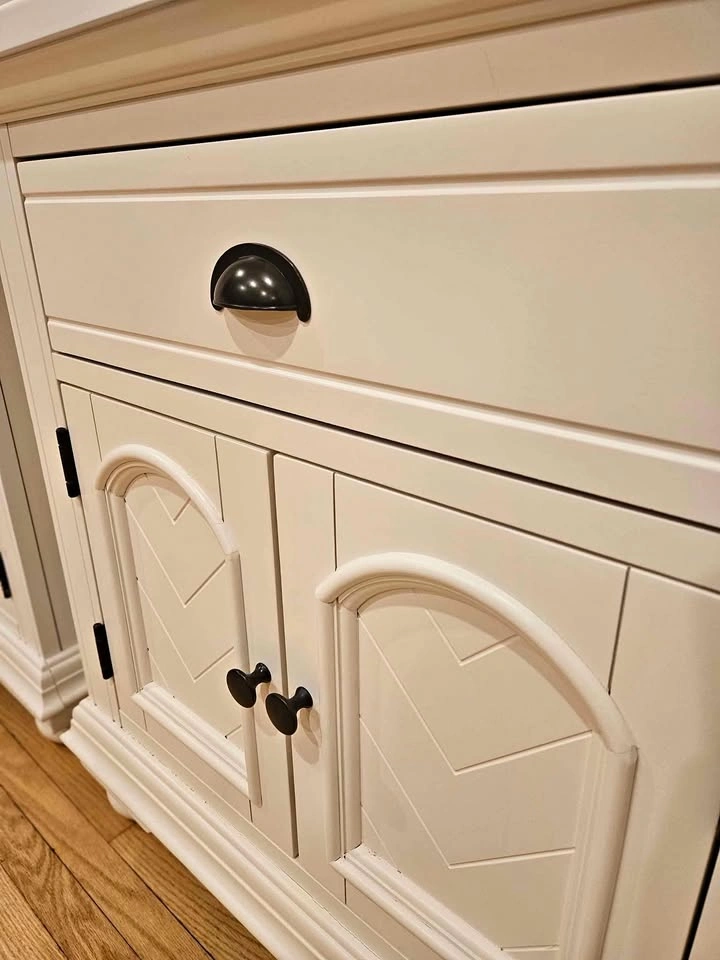 Get the look and feel of cottage charm with the Addison collection featuring chevron patterned veneers in a casual white finish. One drawer and two doors for ample storage. Slight yellowing on top back left corner of one of the nightstands (see last photo). Price is for the pair.