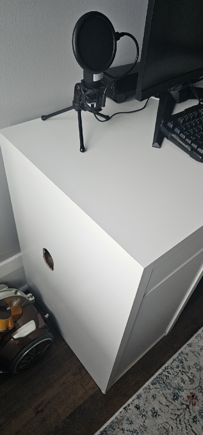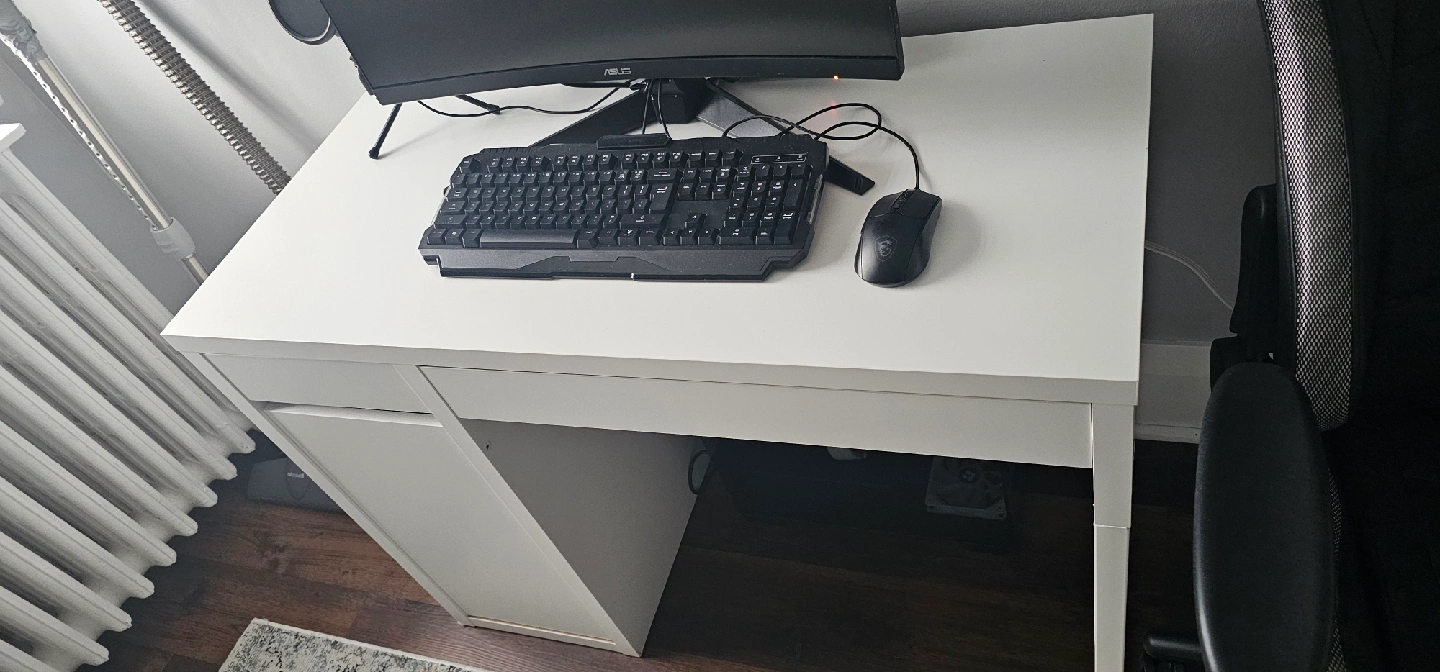 Selling a white IKEA desk. I drilled a hole on the side to pass the cable through.