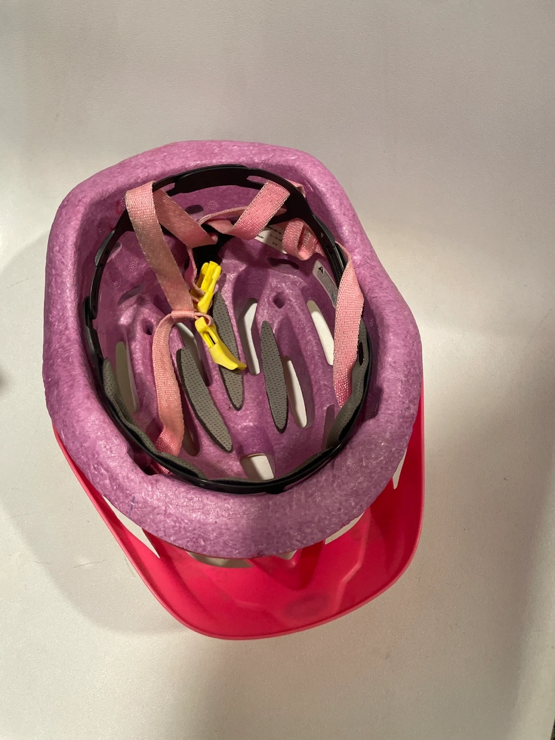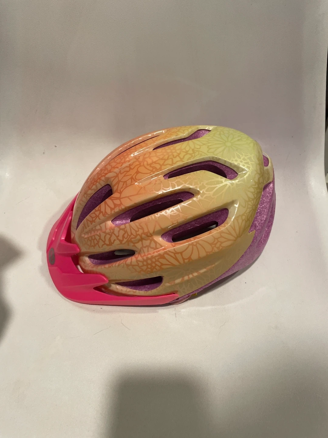 607Buy helmet and throw in a bike. Selling a Bell kids' bike helmet in great shape! It features a fun pink and yellow design. Also including a Supercycle kids' bike, perfect for learning to ride.