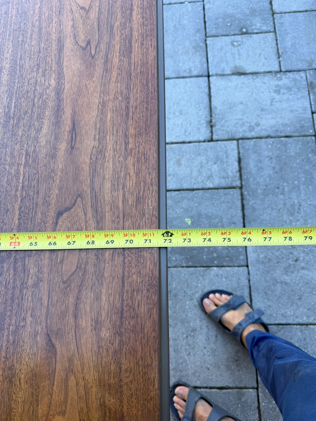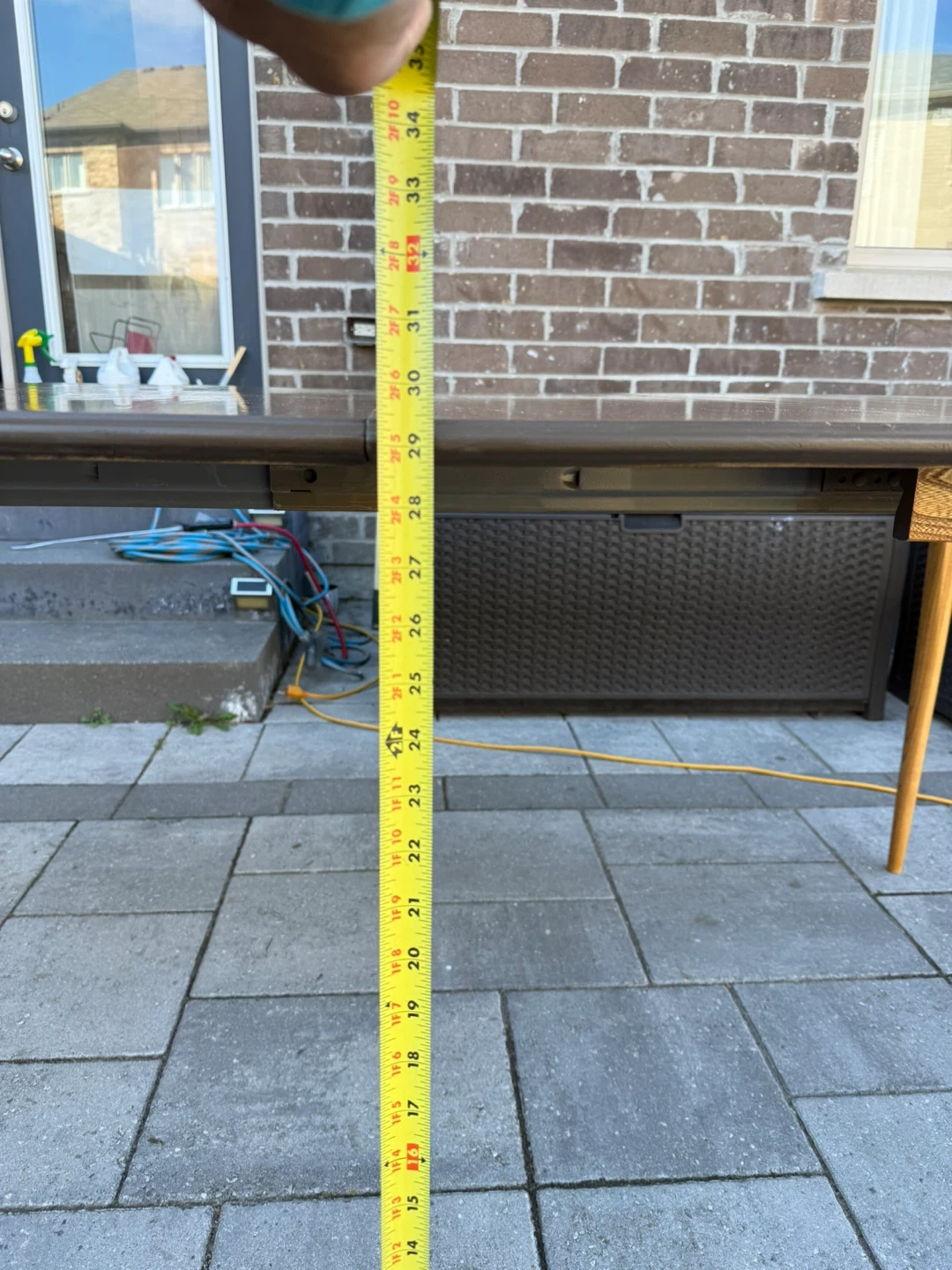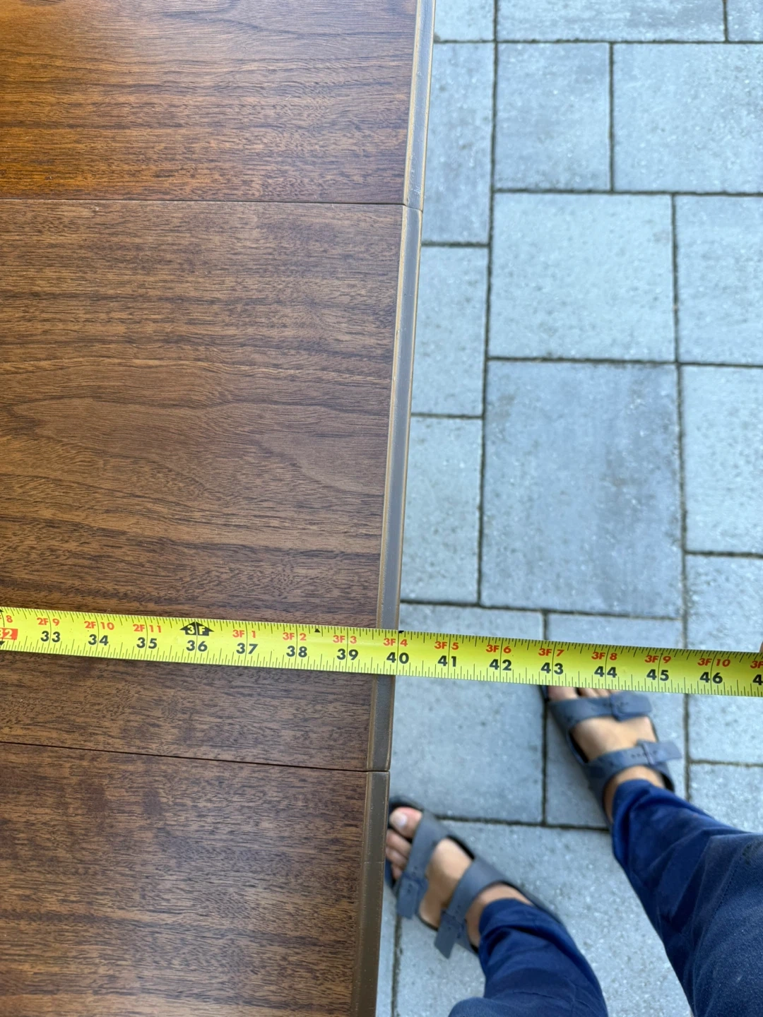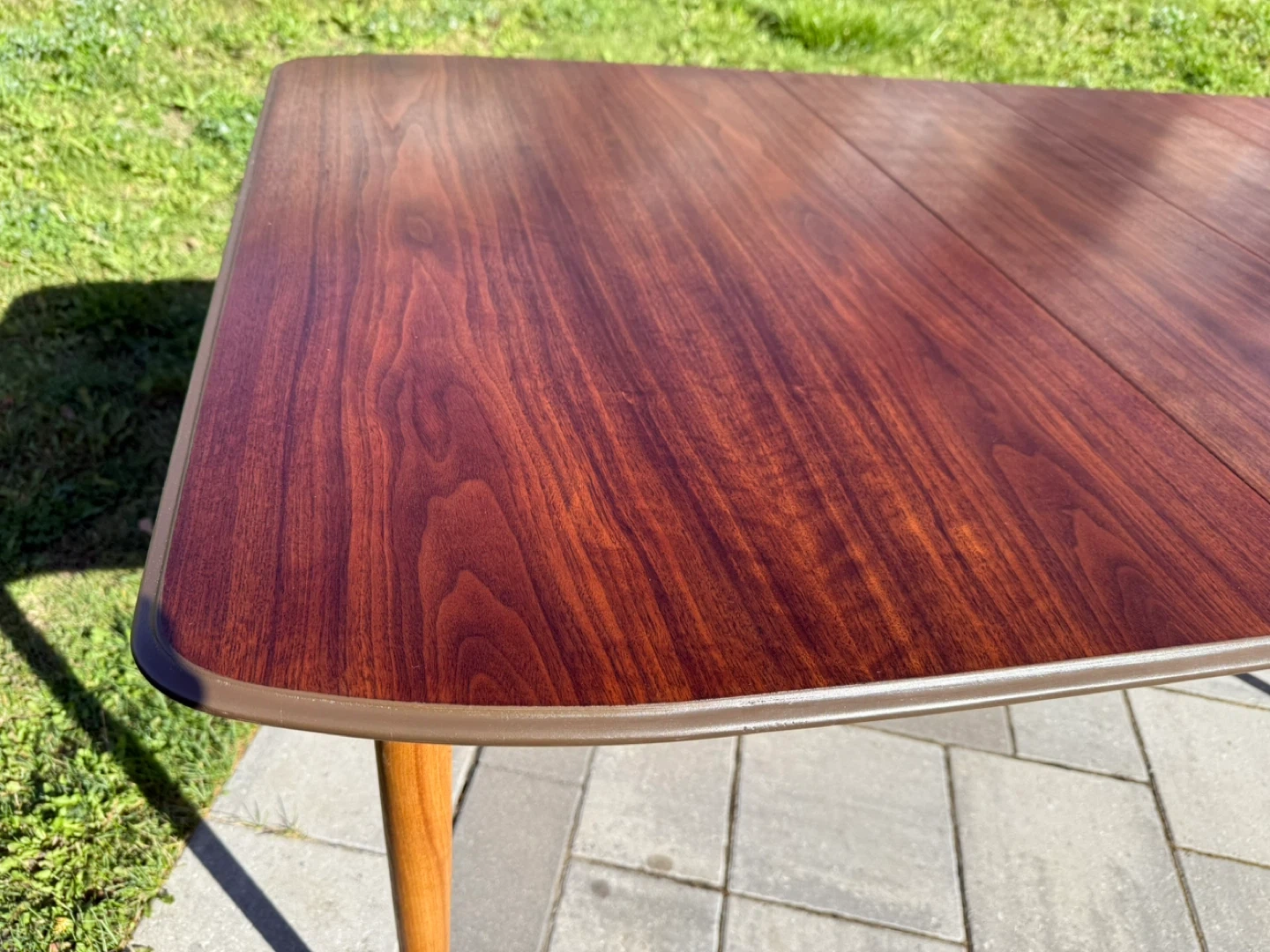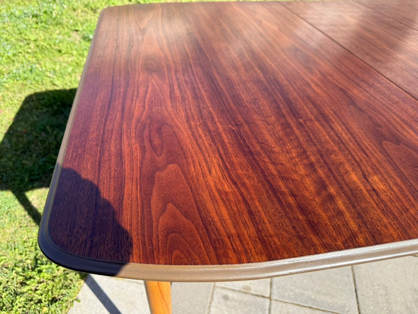 10Selling a lovely wood dining table. The tabletop has a beautiful wood grain pattern. The legs are a light wood colour, and the table has a brown trim around the edge. It's in great condition and ready for a new home!