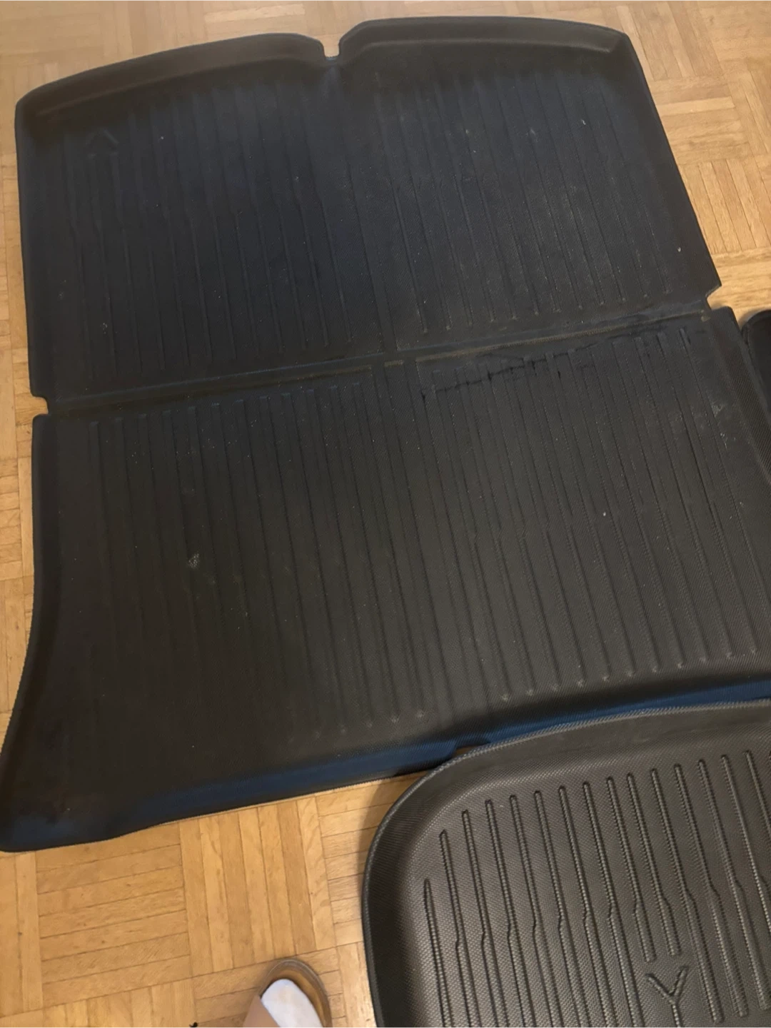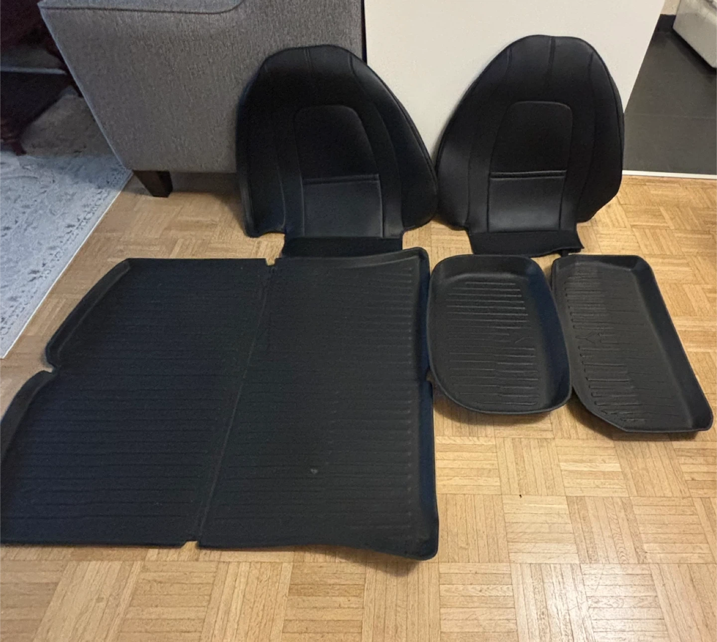 Selling a set of black car floor mats and seat covers. They appear to be in good condition and ready to use in your vehicle