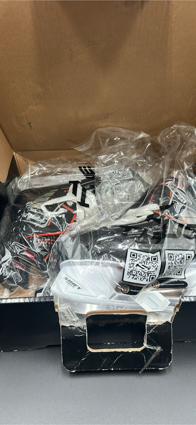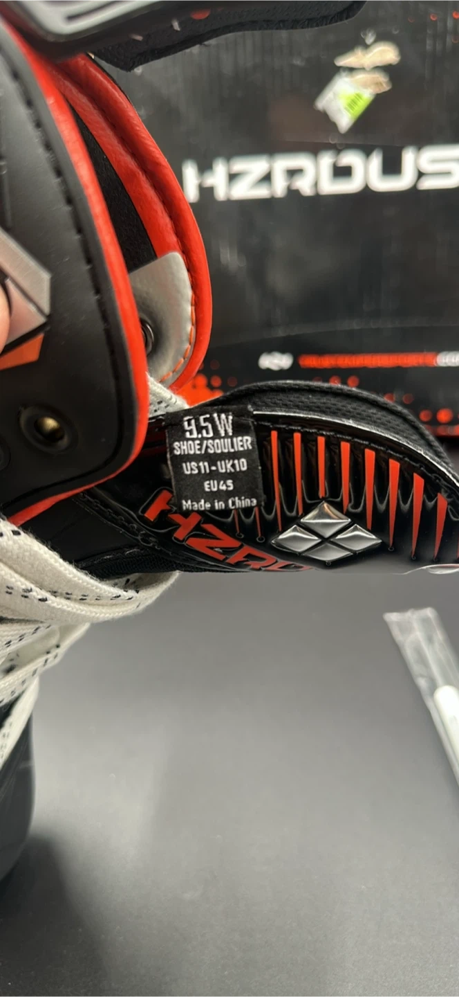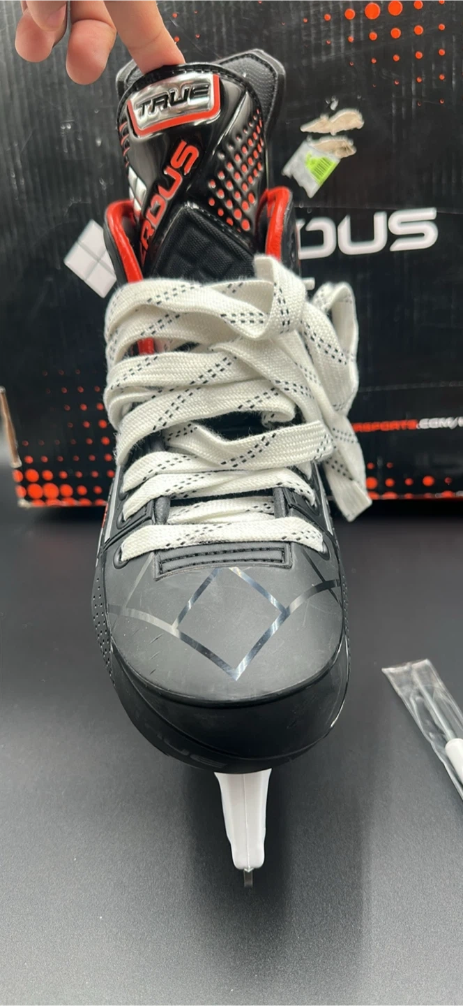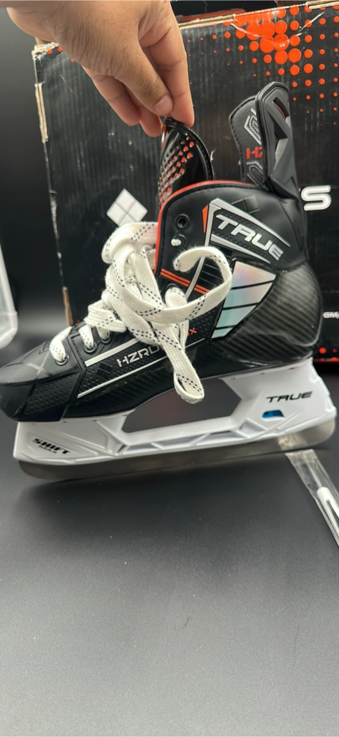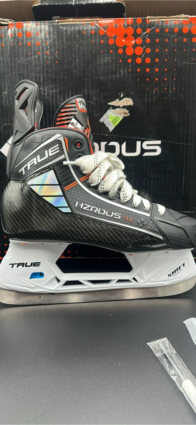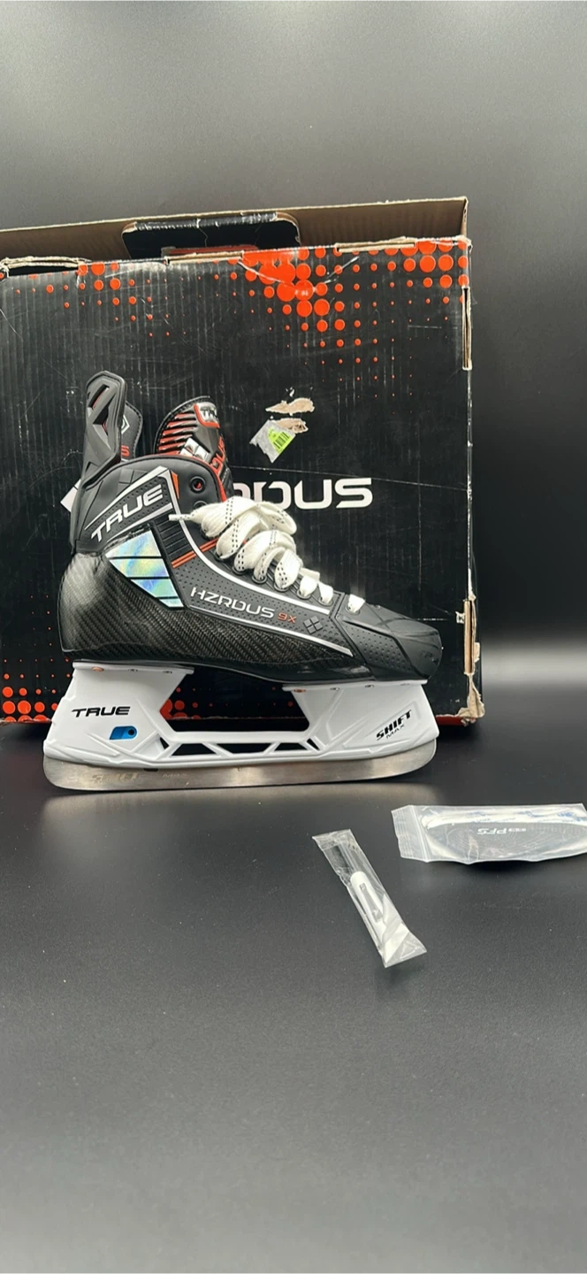 83Selling a pair of TRUE HZRDUS 9X ice hockey skates! They are in excellent condition and come with the original box. These skates feature a sleek black design with red accents and a carbon fibre pattern. Perfect for hitting the ice and improving your game!