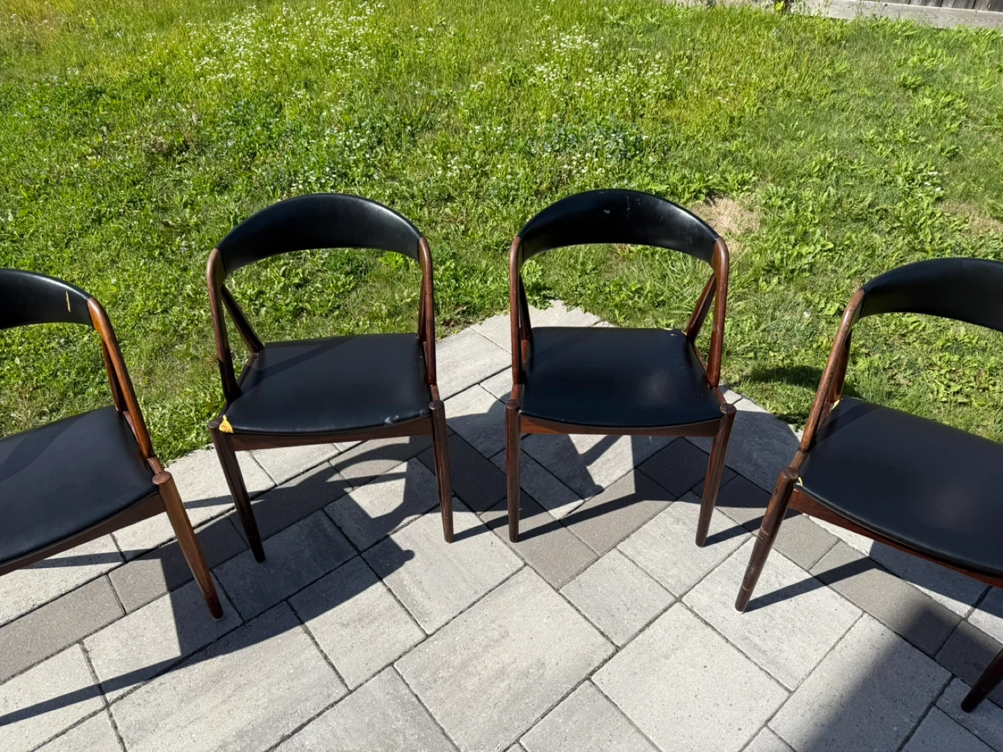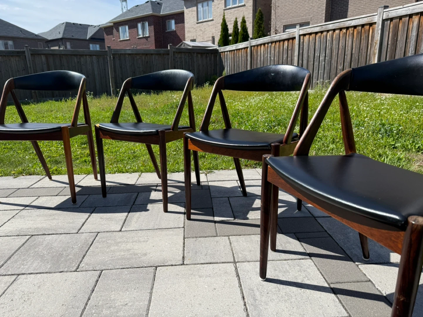 10Selling a set of four mid-century modern dining chairs. These chairs feature a sleek design with a black leather seat and a rich wood frame. They would be a great addition to any dining room or kitchen!