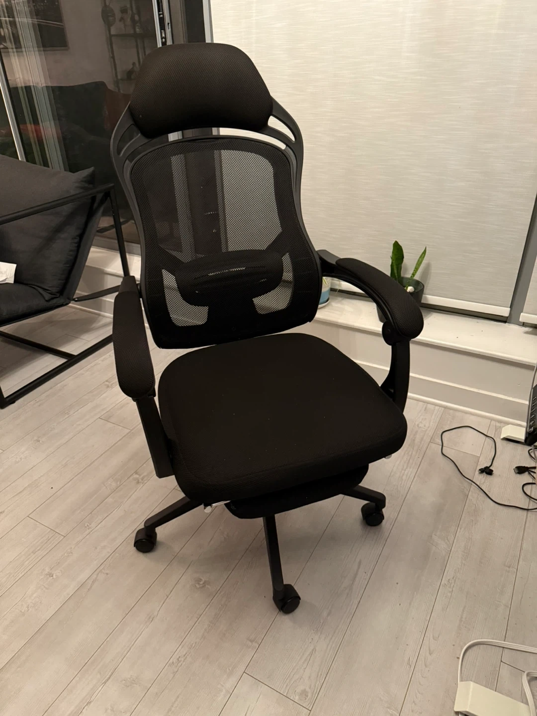 588Selling a comfortable ergonomic mesh office chair in black. It features a supportive headrest and a breathable mesh back for those long workdays. It also has a footrest for added comfort!