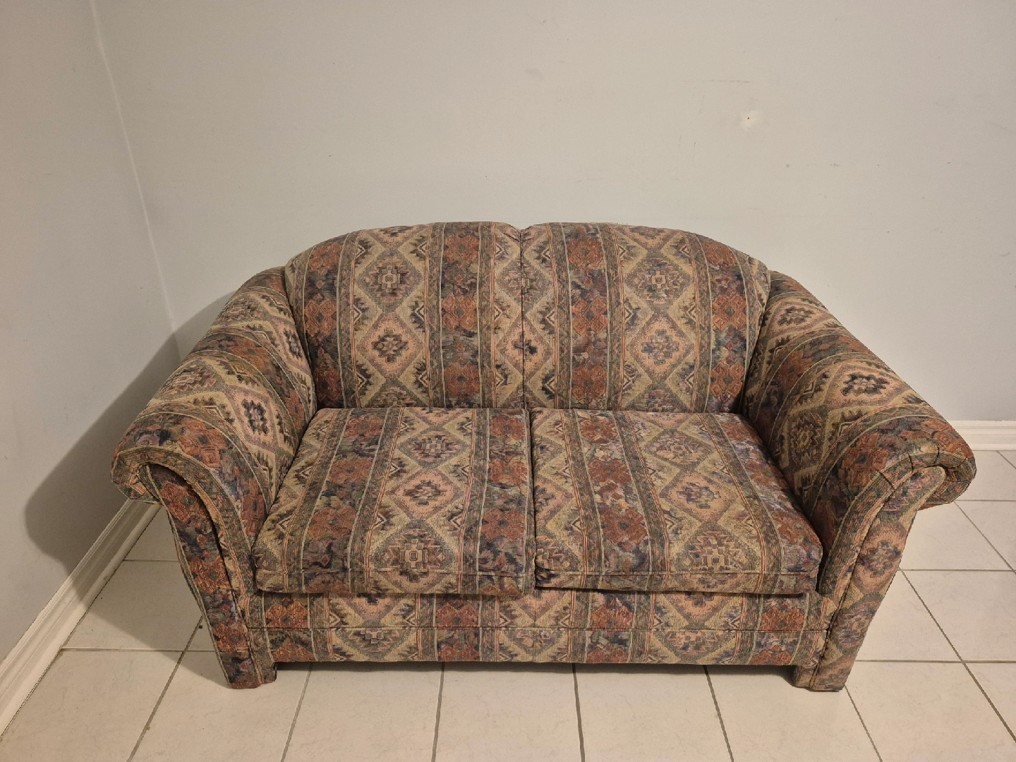 60Here's a cozy loveseat sofa with a unique patterned design! It's perfect for a smaller space or as an accent piece in a larger room. The material is soft and comfortable, making it great for lounging. This loveseat is in good condition and ready for a new home!