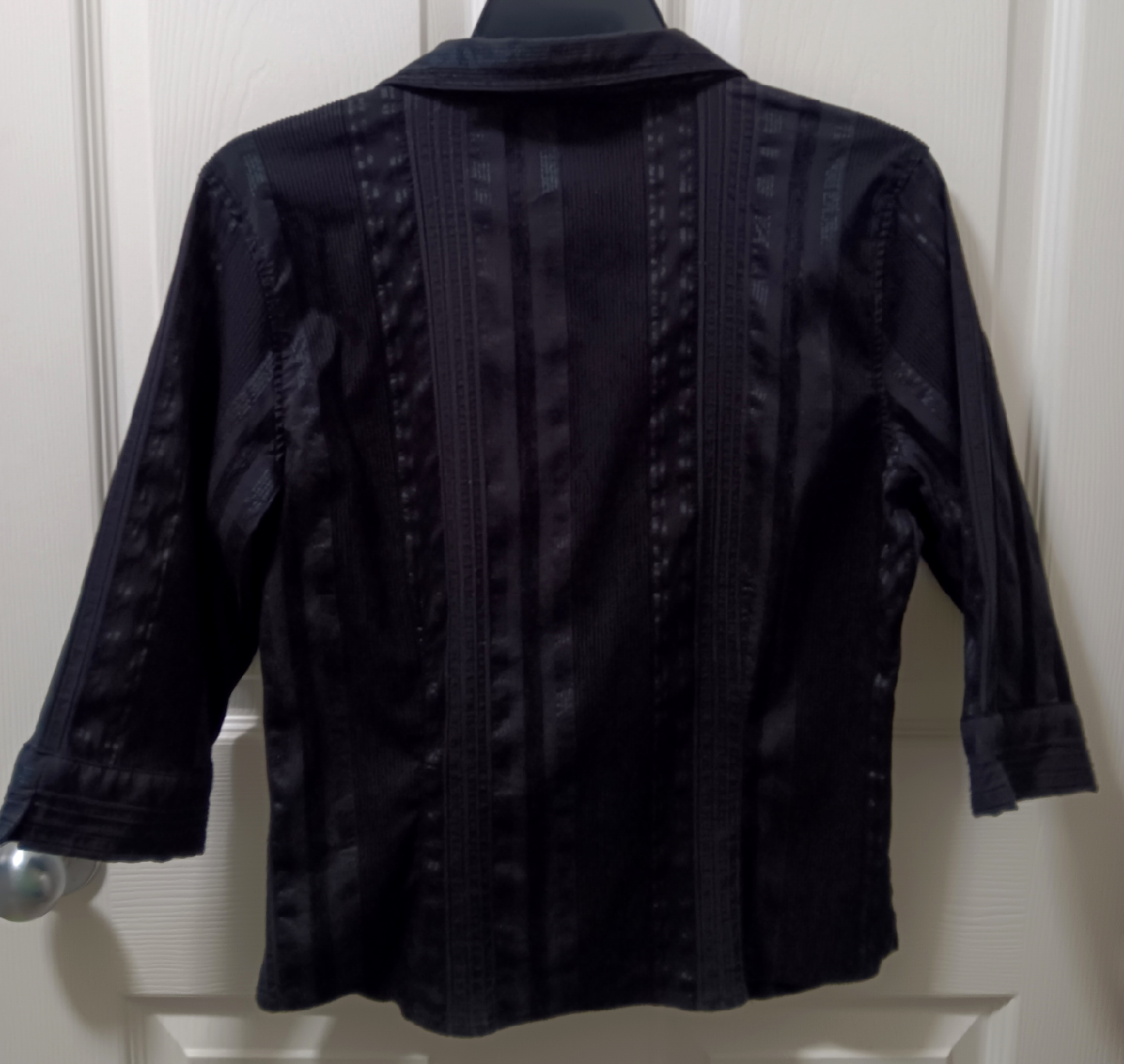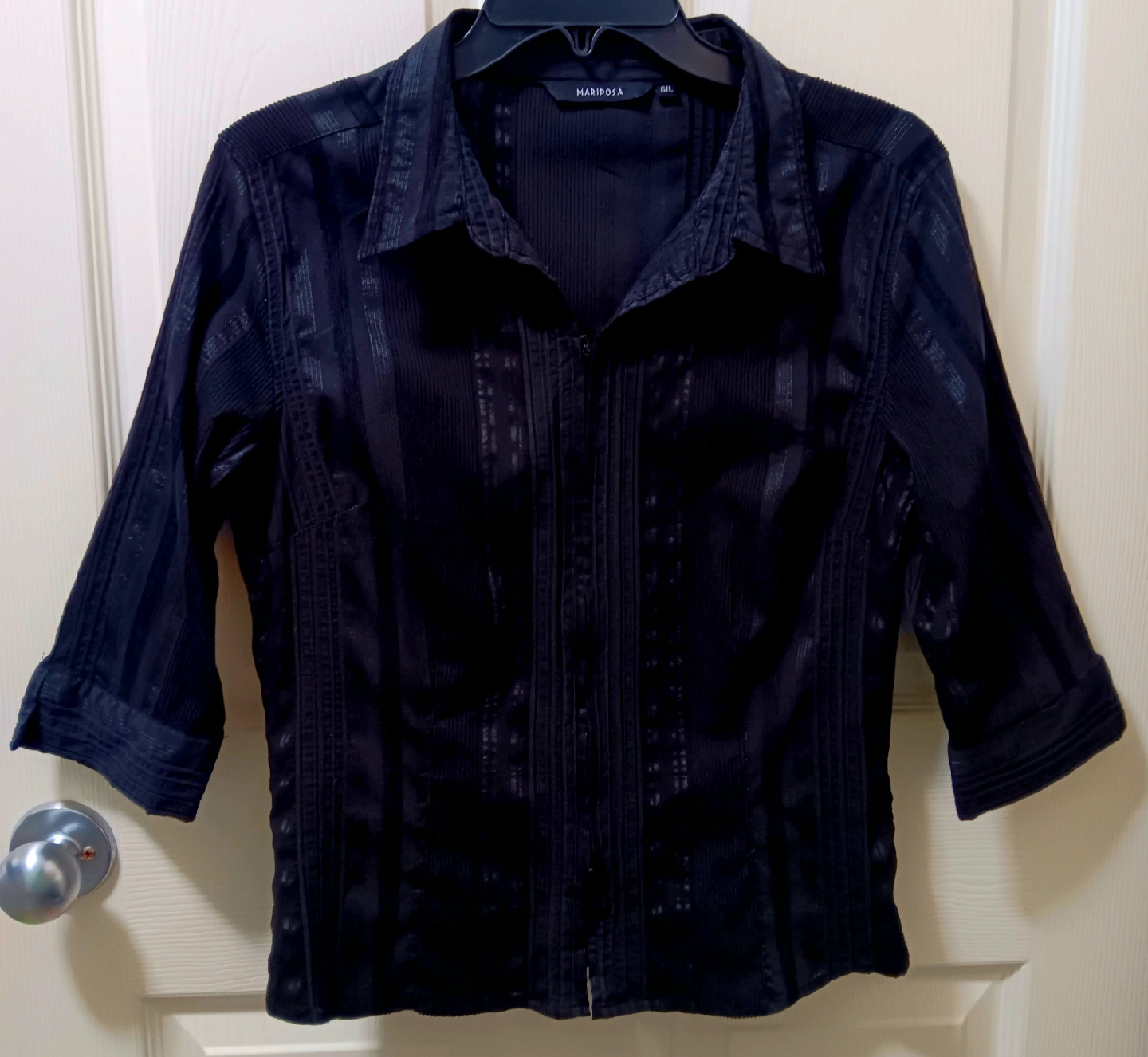 This is a used once Mariposa blouse, size Large, featuring a stylish design with 3/4 sleeves and a unique textured pattern. It's perfect for adding a touch of elegance to any outfit.