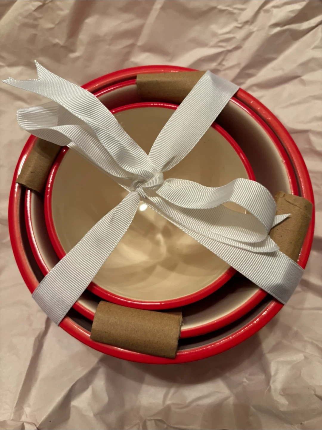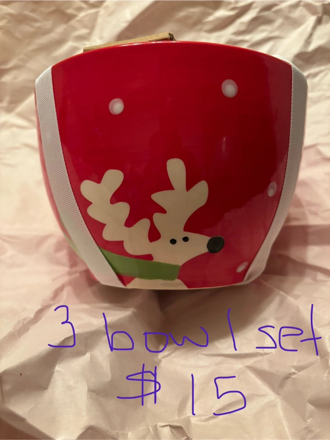 123Selling a set of three Christmas-themed bowls! These are perfect for adding a festive touch to your holiday table. The bowls are red with a cute reindeer design. They're tied together with a ribbon, making them a lovely set