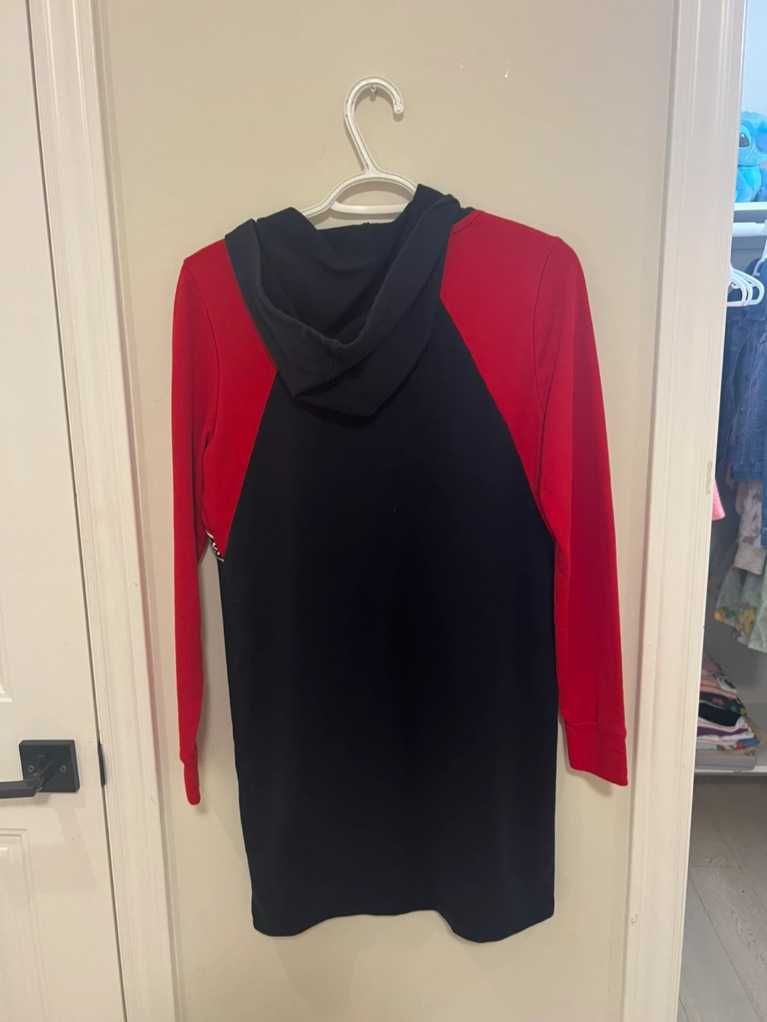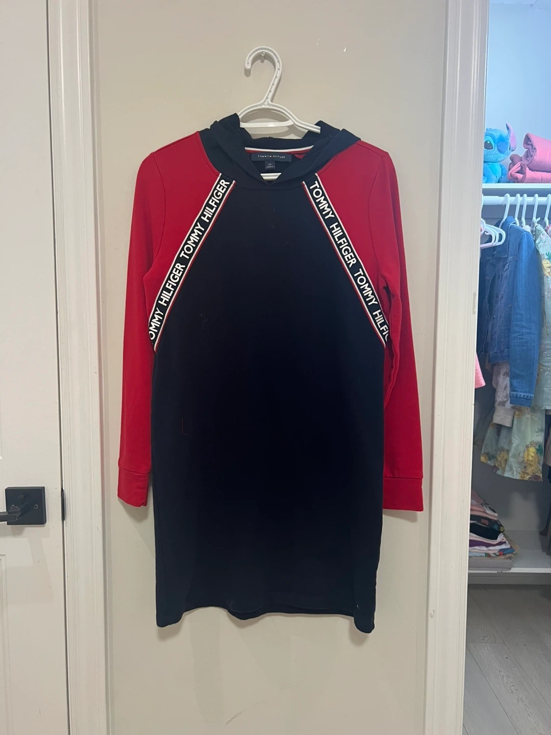 Tommy Hilfiger hoodie dress in size S/P! The dress is black with red sleeves and has the Tommy Hilfiger logo running down the sleeves. It's in great condition and ready for a new home!