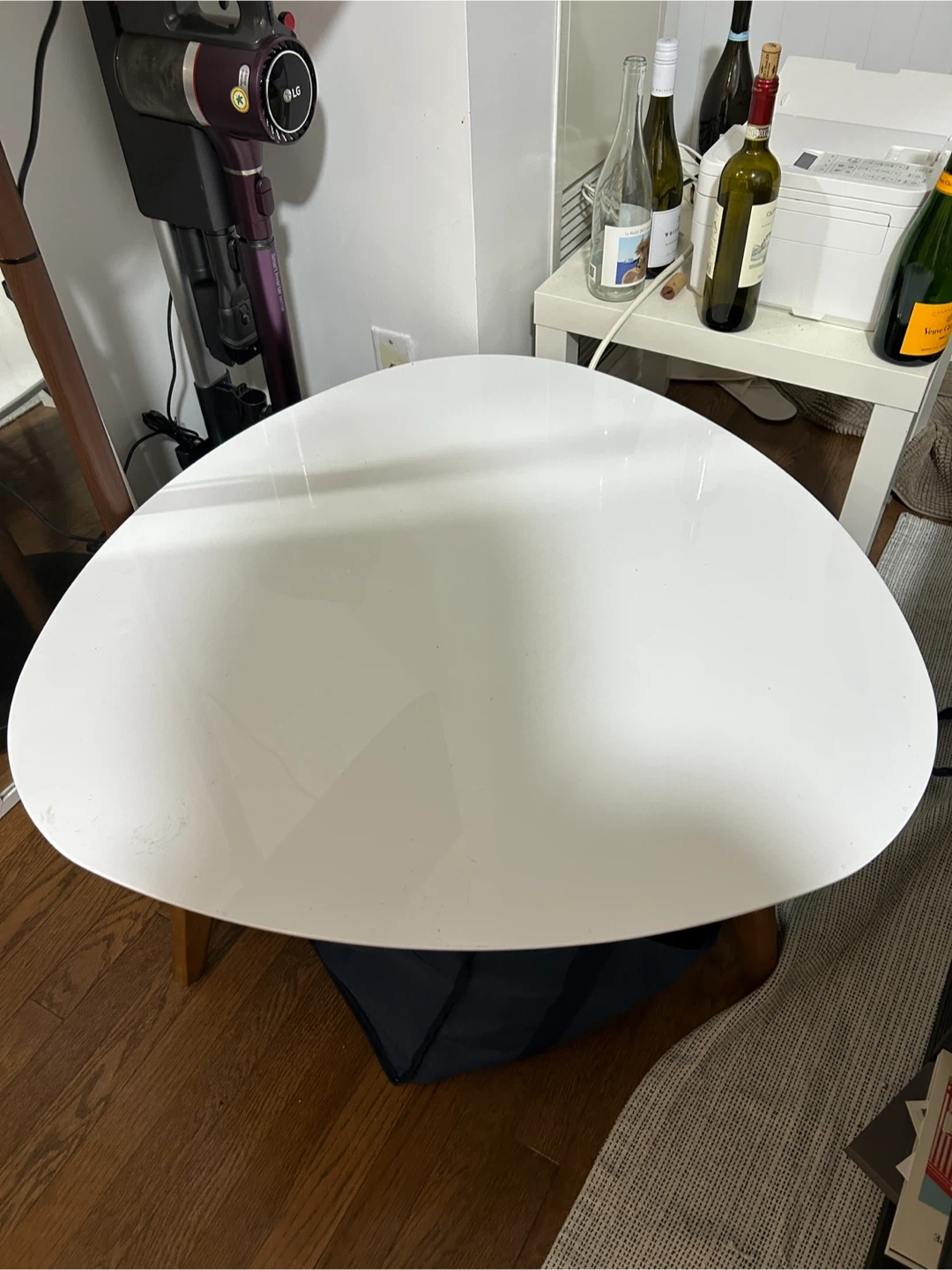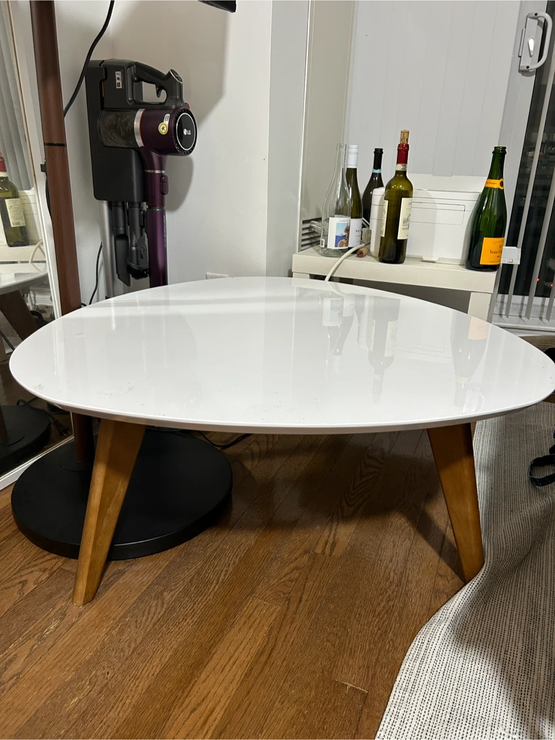 Selling a modern coffee table with a white top and wooden legs (Osaka coffee table from Structube). It's in good condition, but there are some slight signs of use on the top surface. Perfect for a living room or small space!