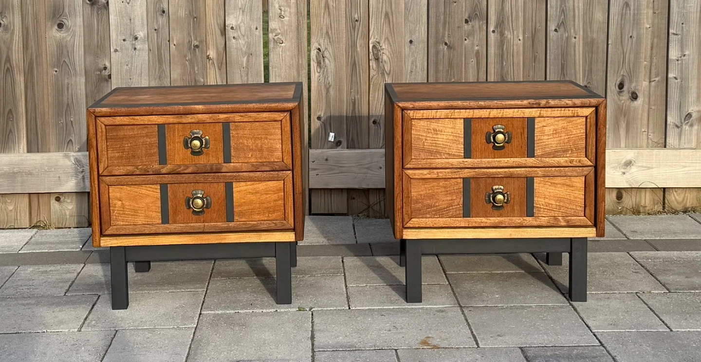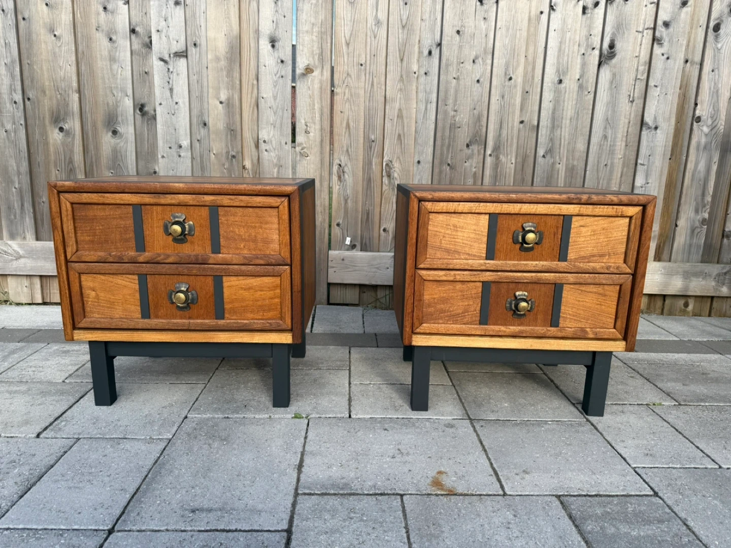Selling a pair of Walnut nightstands. They have a beautiful wood grain finish with black accents and unique drawer pulls. They would make a great addition to any bedroom!