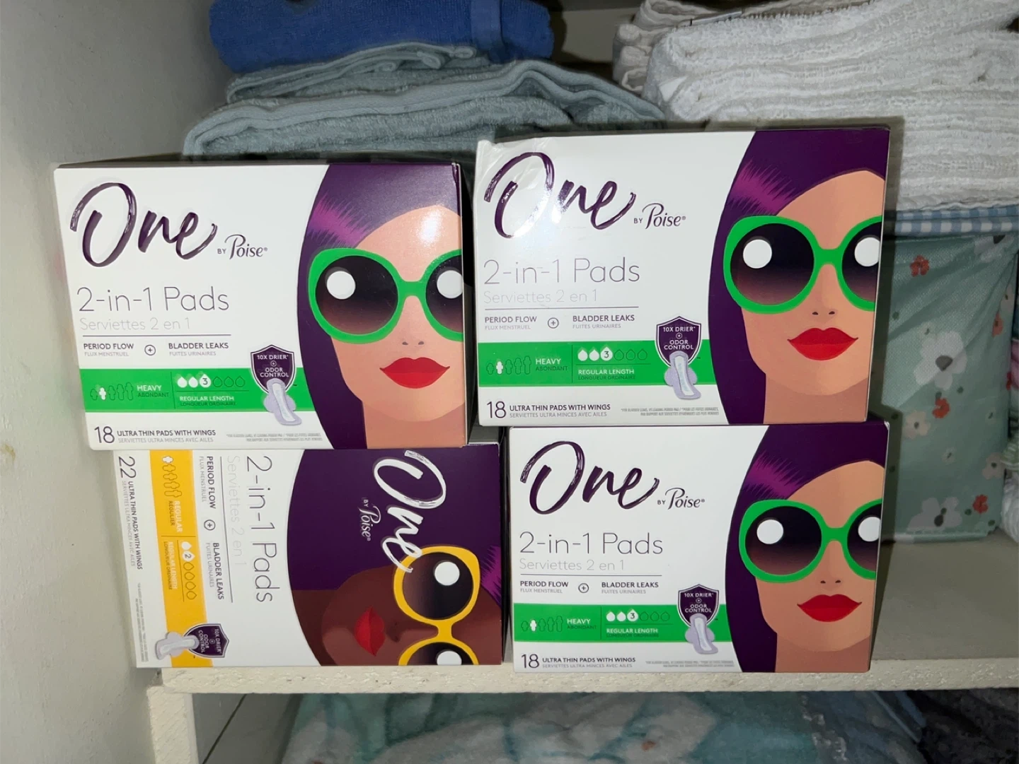 Selling boxes of One by Poise 2-in-1 Pads. Each box contains 18 ultra thin pads with wings. They're designed for both period flow and bladder leaks, offering 10x drier odor control. Great for heavy flow and regular length needs