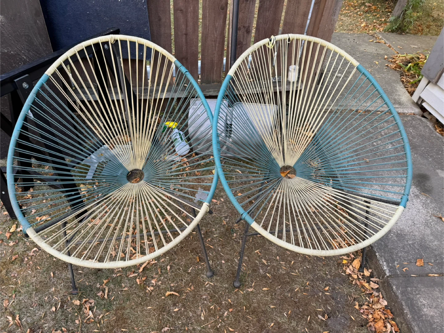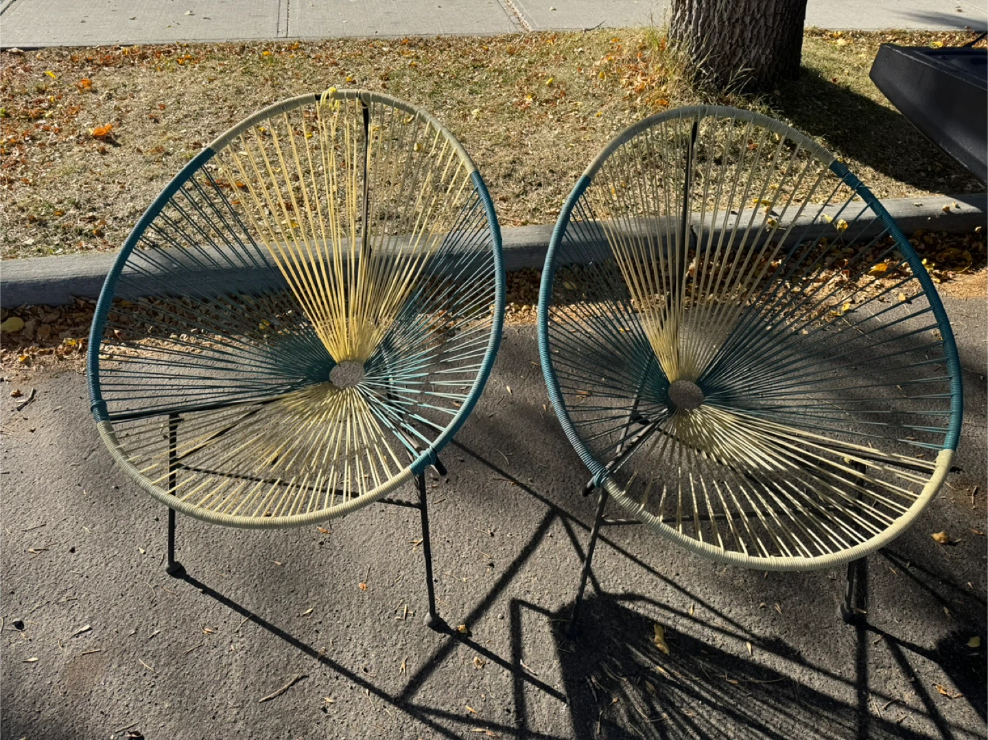 Selling a pair of Acapulco chairs! They're in great shape and would look fantastic on a patio or deck. The chairs feature a cool blue frame with cream-colored woven seating. They're super comfortable and stylish, perfect for relaxing outdoors