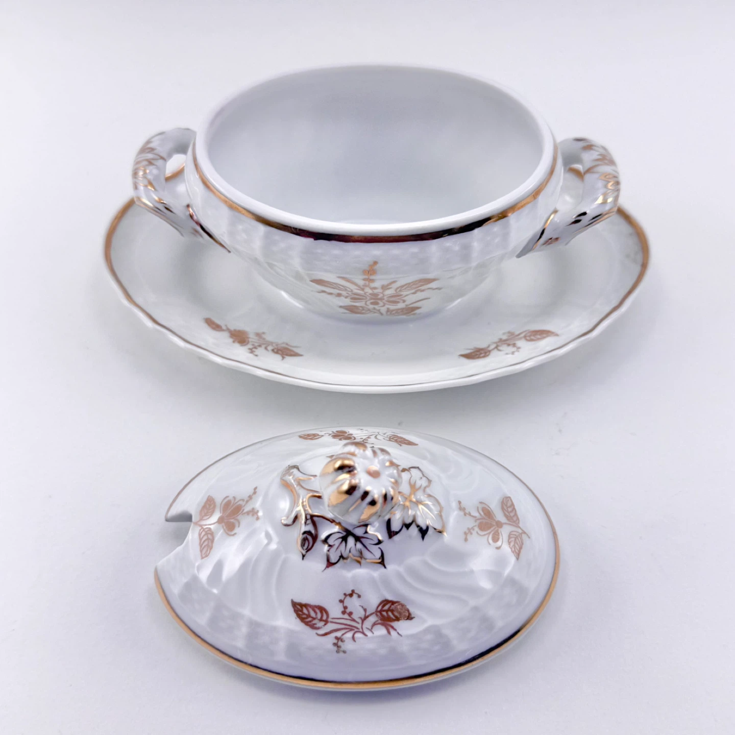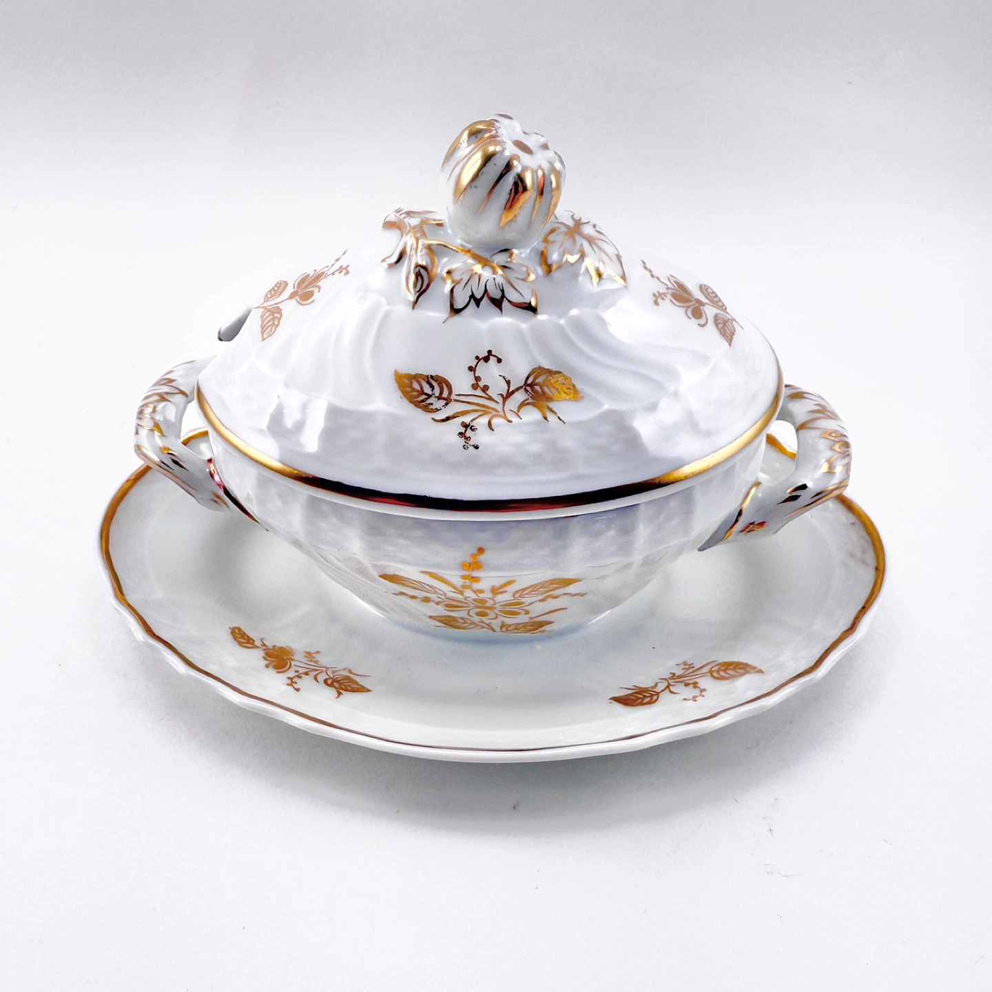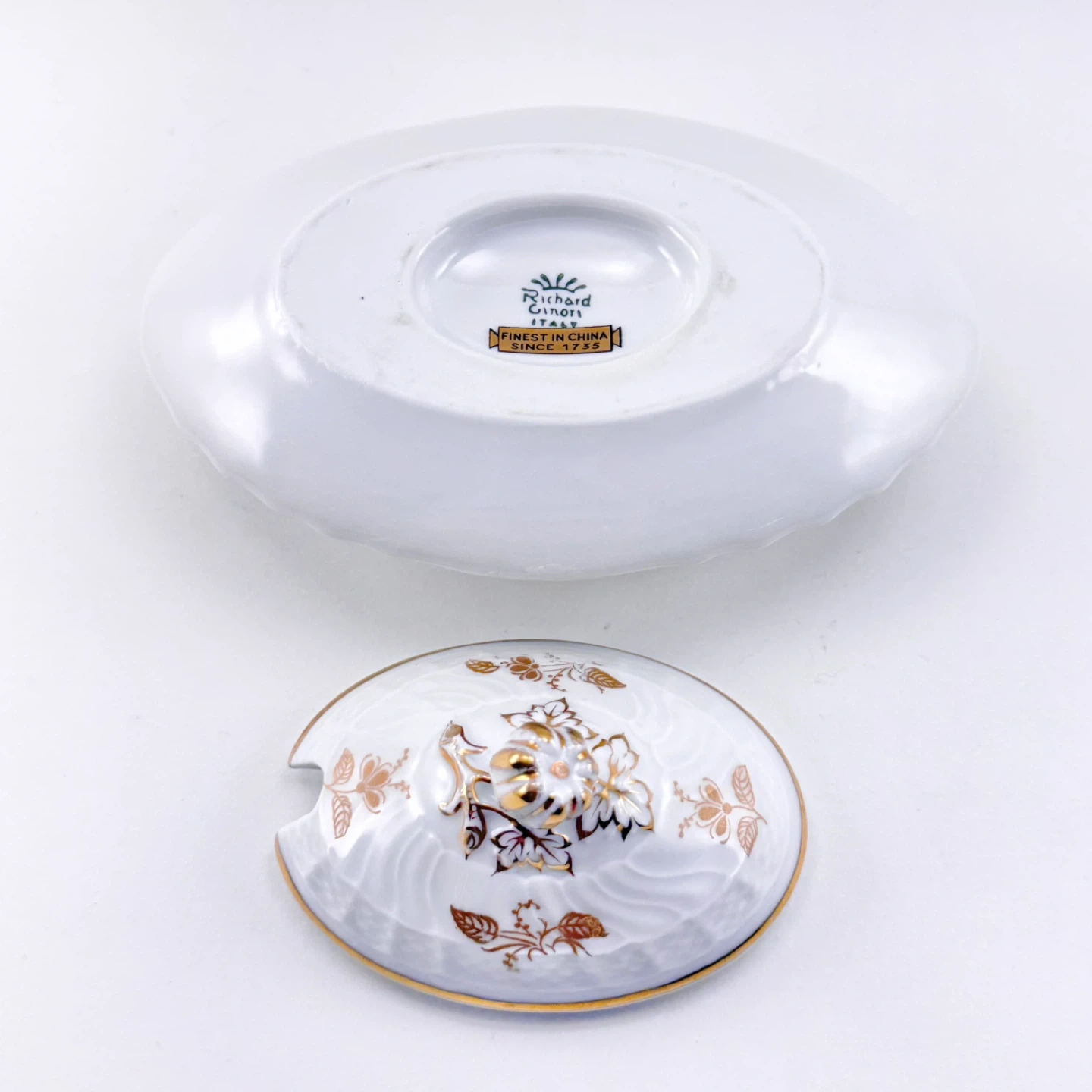 Rare vintage Richard Ginori lidd d jam pot (made in Italy) decorated in gold. No chips, cracks, crazing or gold loss. Measures 5.5” long (underplate edges) x 3.75” high