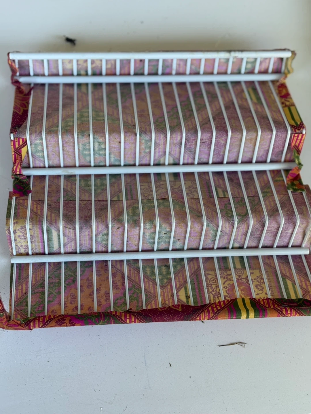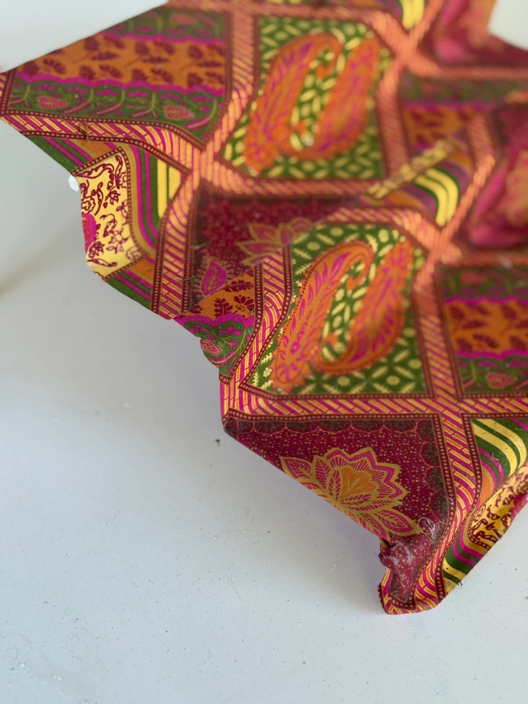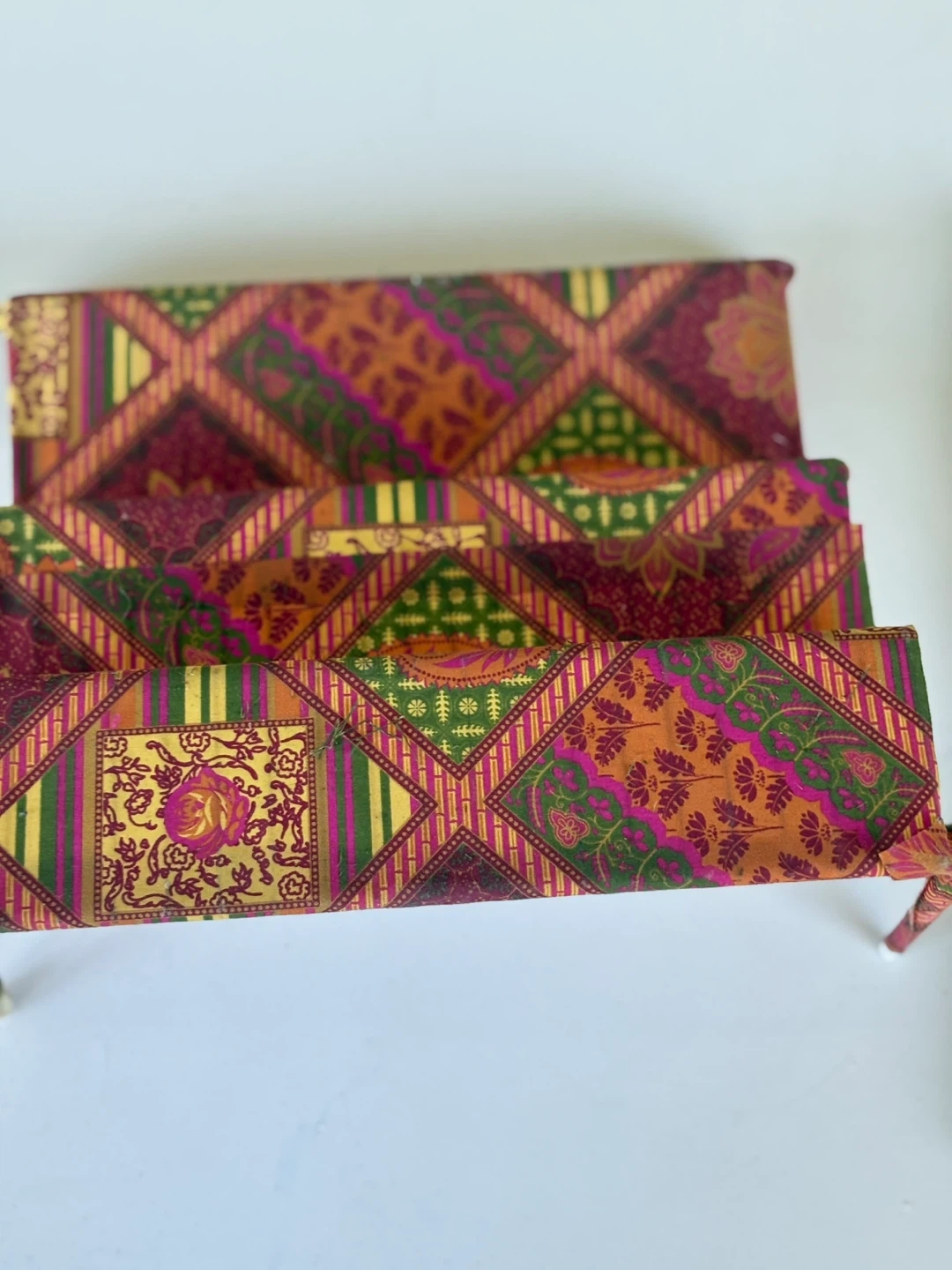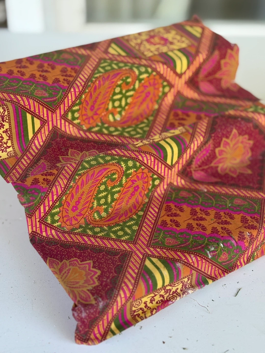 Selling a unique, handmade shelf covered in colourful fabric. It's perfect for adding a touch of personal style to any room. The fabric features a vibrant mix of colours and patterns, making it a standout piece. It's in good condition and ready to use