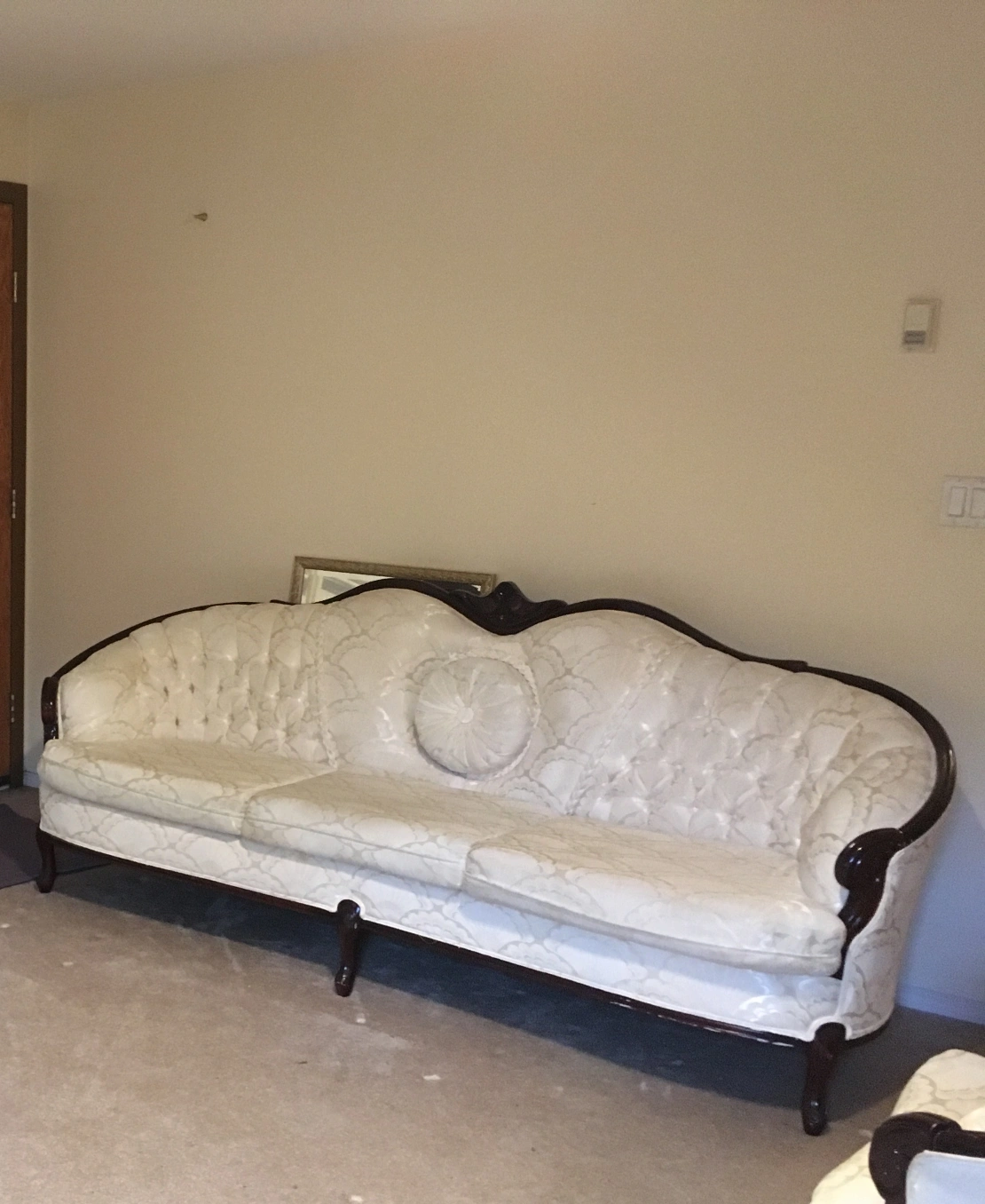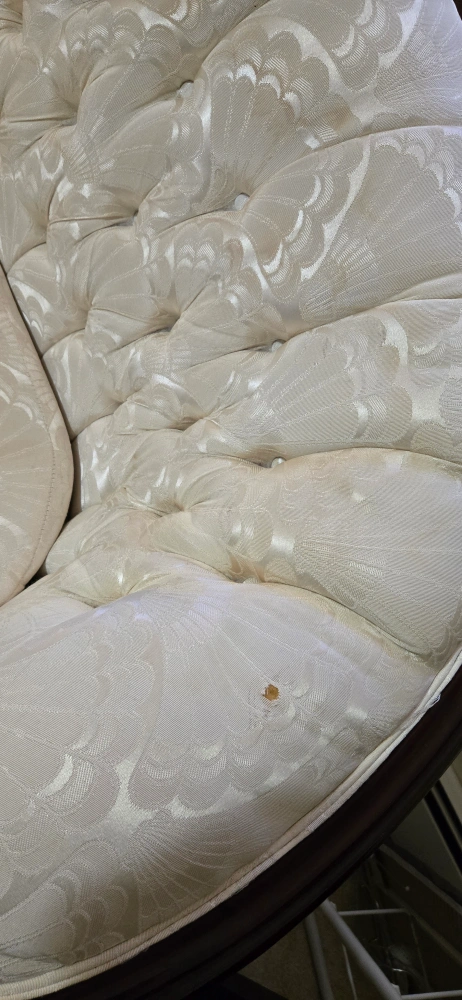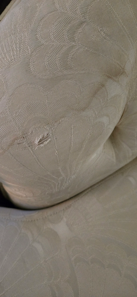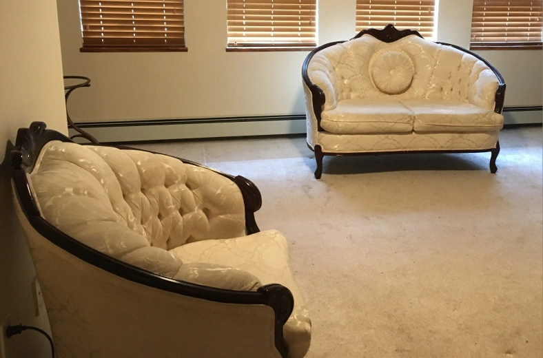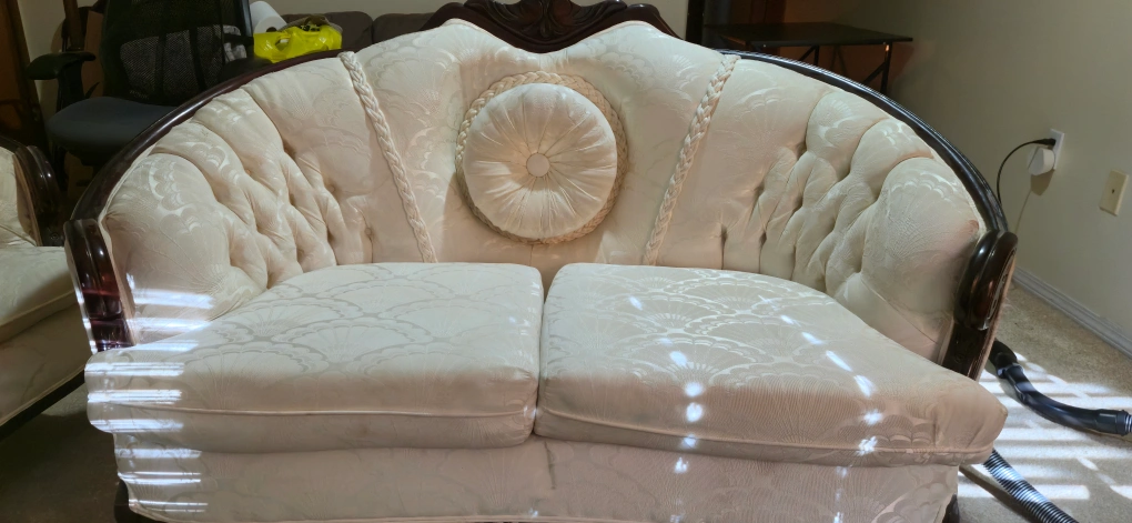 Selling a beautiful antique-style sofa and loveseat set. The set features a cream-coloured patterned fabric and dark wood trim. There are some signs of wear, but overall it's in good condition and ready to add a touch of elegance to your home! Looking for reasonable offers only, no low ballers.