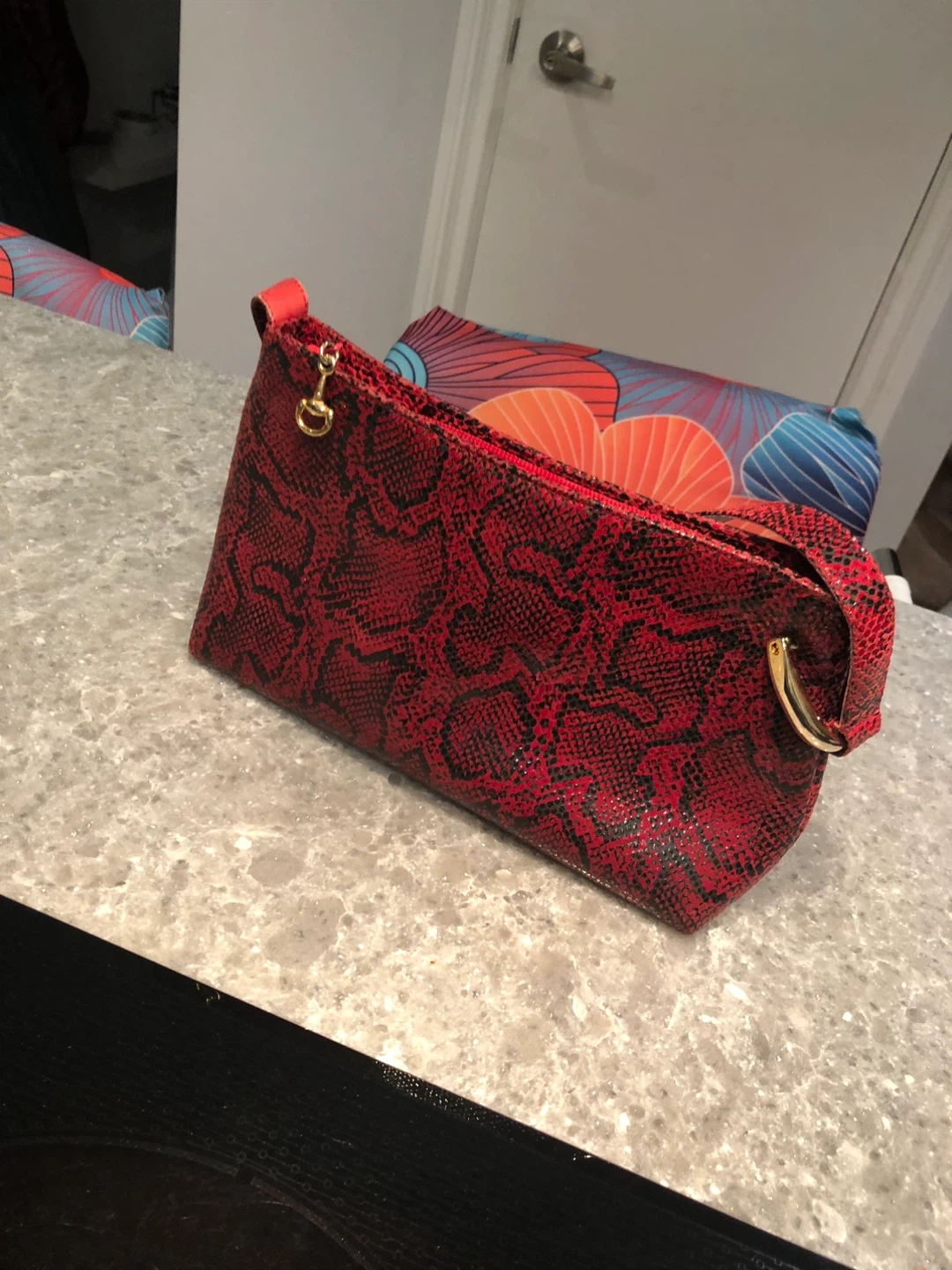 Selling a stylish Due Fratelli handbag! It features a striking red snakeskin pattern and is made of genuine leather. Perfect for adding a pop of colour to any outfit!
