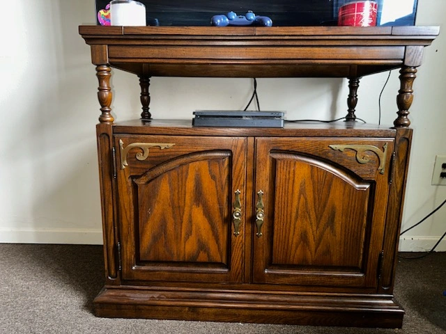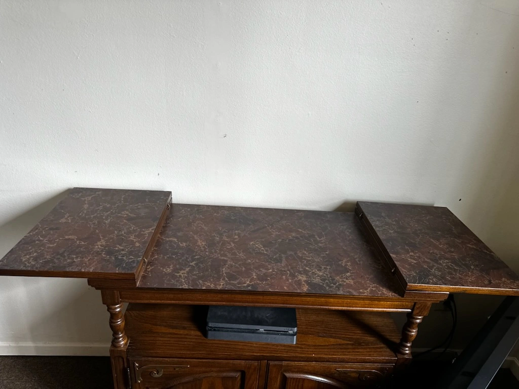 Selling a wooden TV stand with a storage cabinet. It has a classic design with ornate detailing. The stand also features pull-out extensions on the top surface for extra space. Great for any living room!