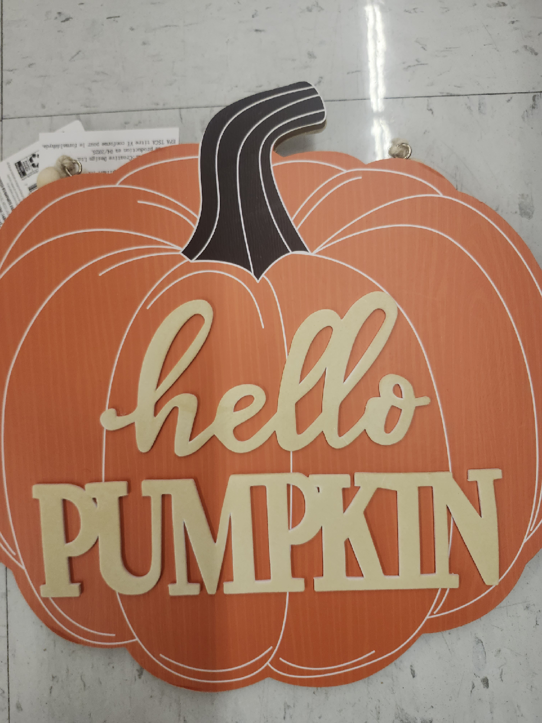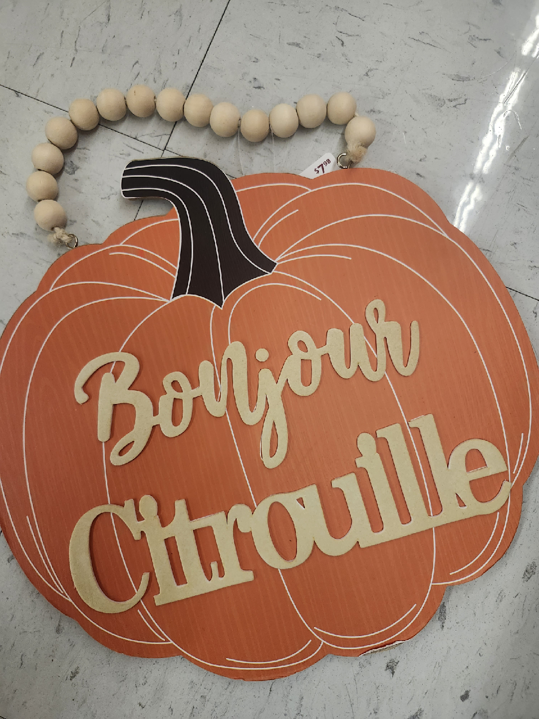 Cute fall pumpkin sign with wooden bead hanger! One side says "Bonjour Citrouille" and the other side says "Hello Pumpkin"
