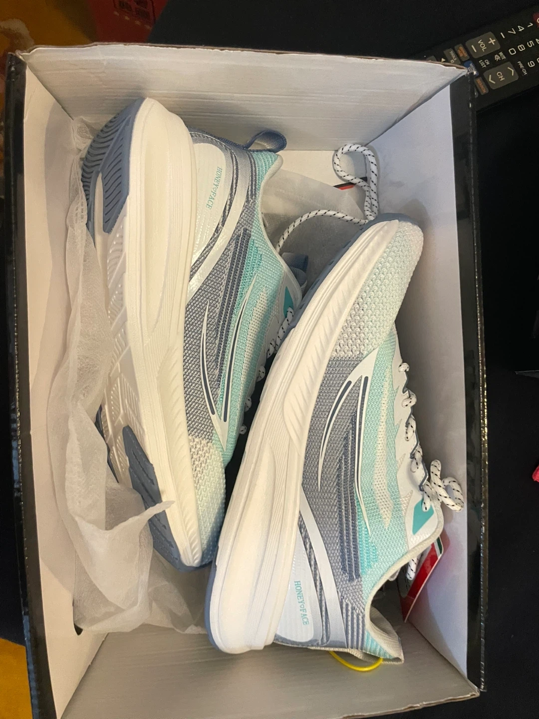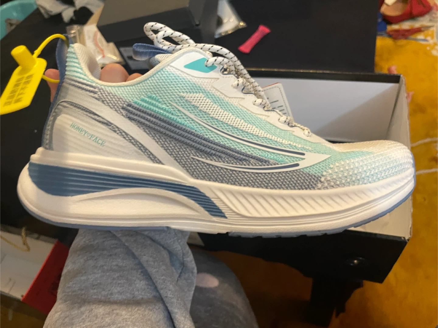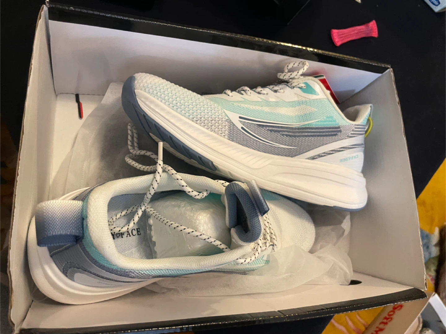 Selling a BRAND NEW NEVER WORN pair of Honey Face running shoes in EUR size 40. These shoes feature a stylish design with a combination of ivory, light blue, and mint green colours. The upper material is made of woven fabric and adhesive printed material, with a high-elastic EVA sole. Comes with the original box!
