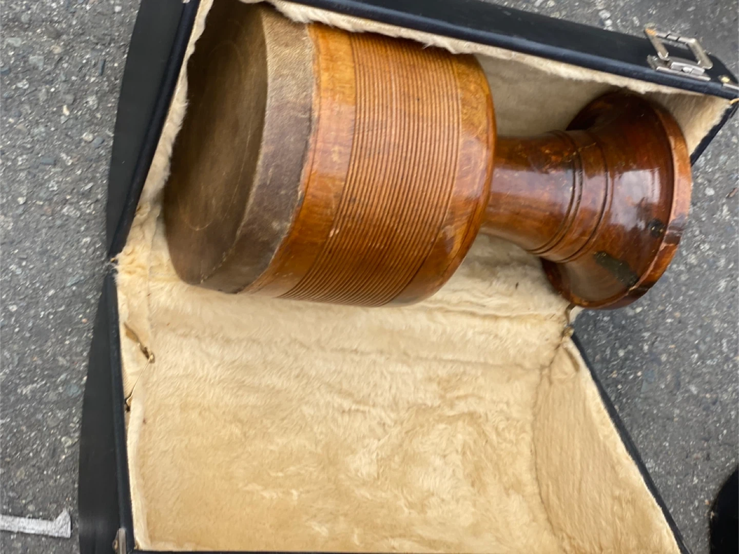 103Selling a vintage goblet drum, crafted from wood with a leather top. It comes with a hard case for protection and easy transport. A unique addition for any music enthusiast or collector!
