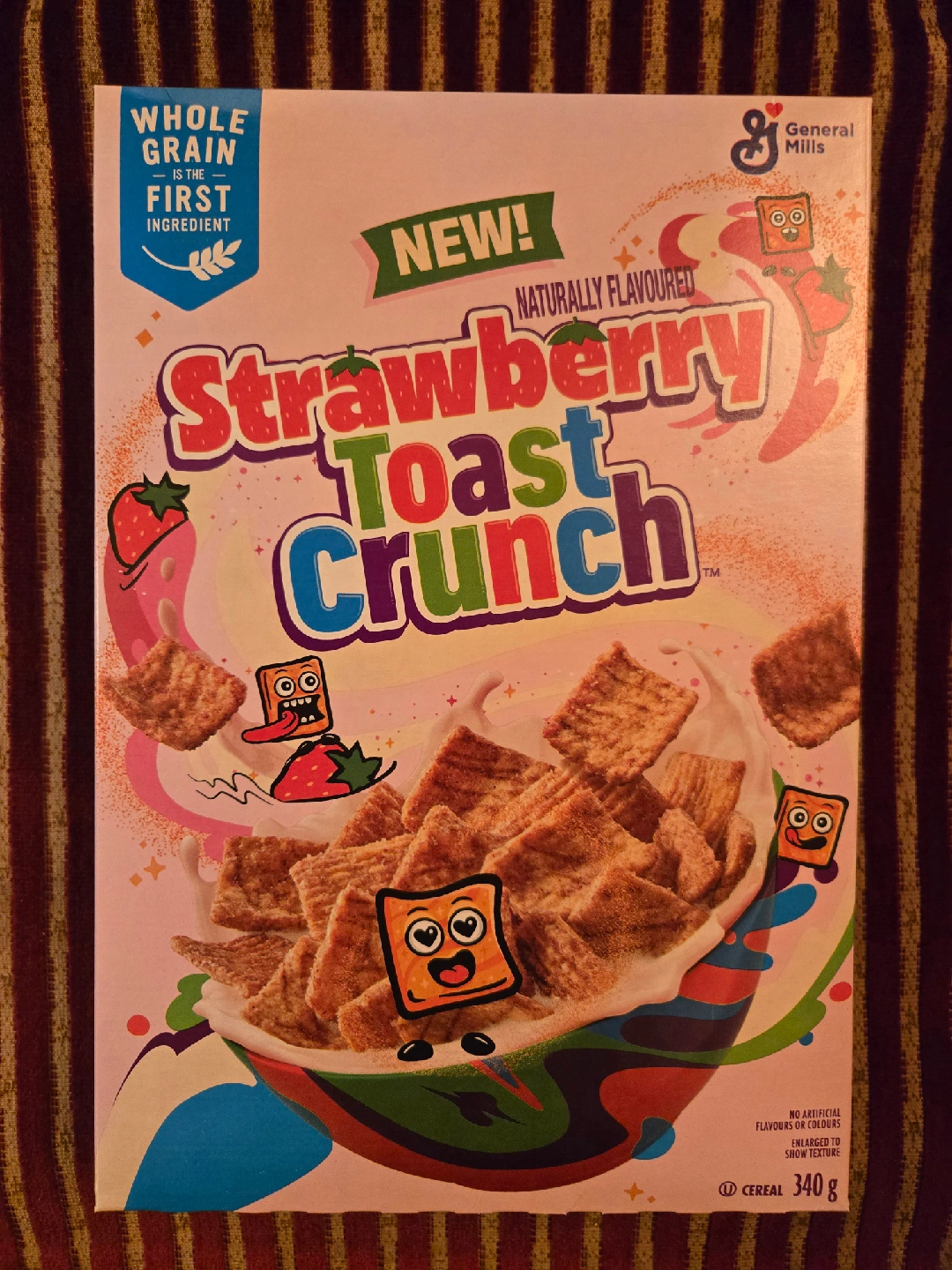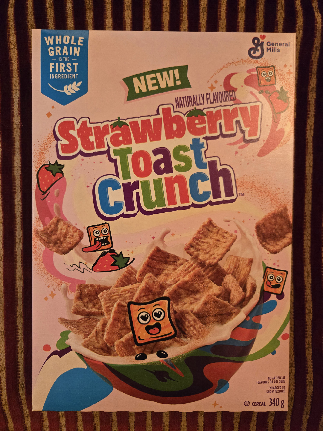 Strawberry Toast Crunch cereal! It's naturally flavoured and whole grain is the first ingredient. The box contains 340g of cereal.