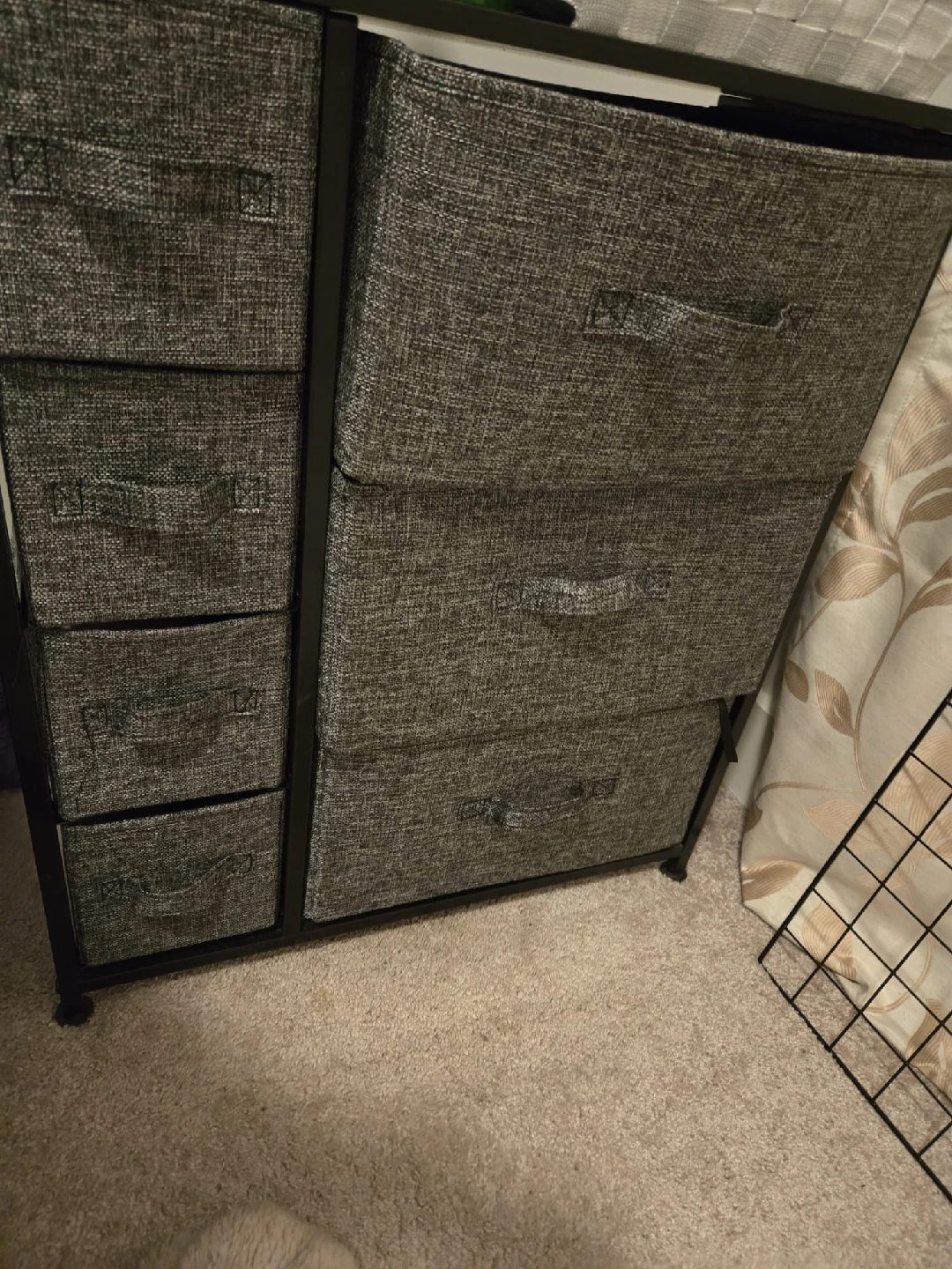 Selling a grey fabric storage dresser! It has a black metal frame and multiple drawers. Perfect for organizing clothes or other items in a bedroom or closet. It's in great condition and ready for a new home