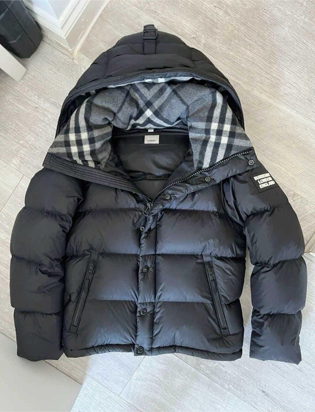 -715Selling a Burberry black puffer jacket. It's in new condition and features the classic Burberry check pattern on the inside of the hood. Perfect for staying warm this winter!