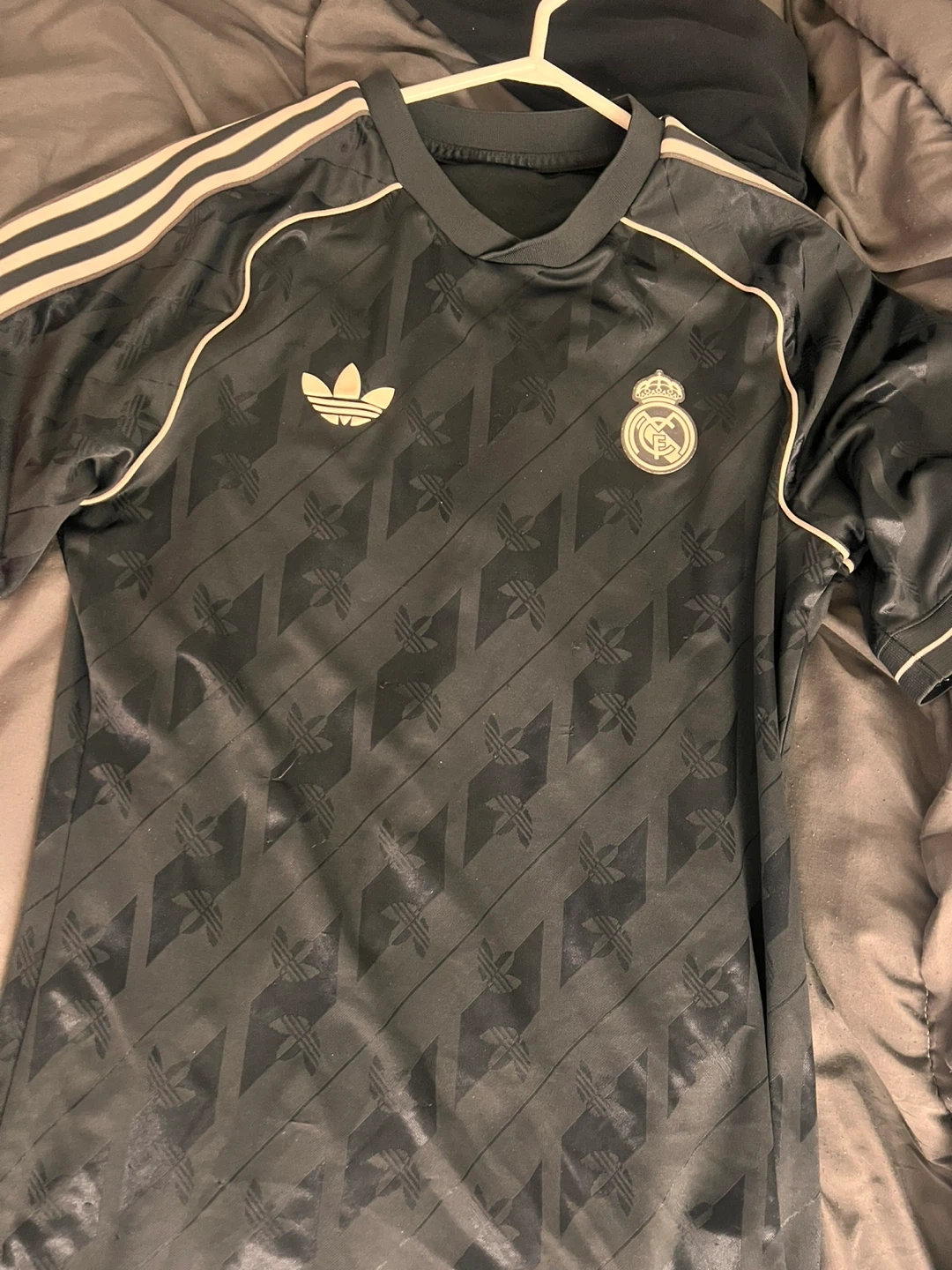 Selling an Adidas Real Madrid jersey. It's black with the Adidas logo and the Real Madrid crest. Features the classic three stripes on the sleeves. Great for any fan!