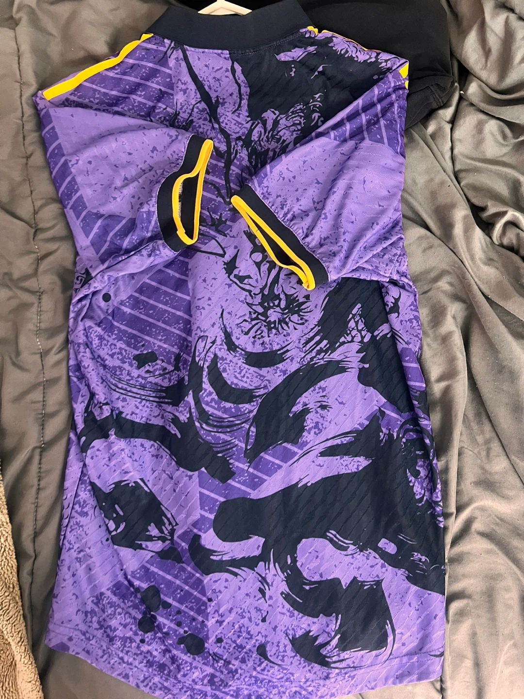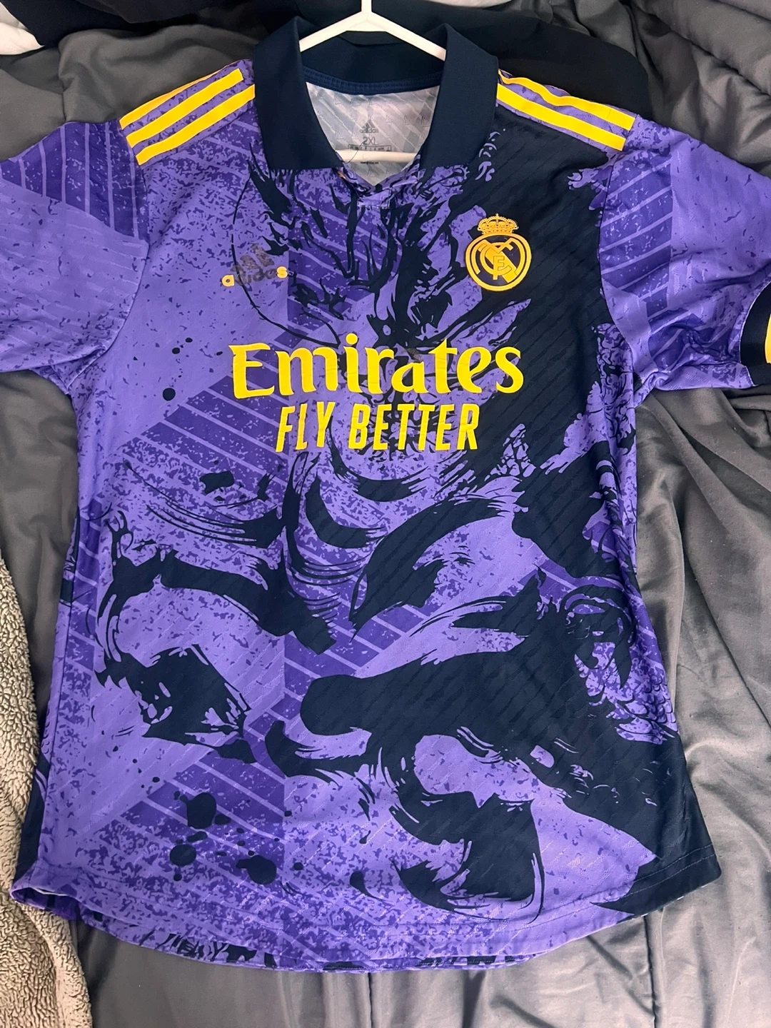 Selling an Adidas Real Madrid jersey in a unique purple and black design! It features the Emirates FLY BETTER logo and the Real Madrid crest. A great piece for any fan!