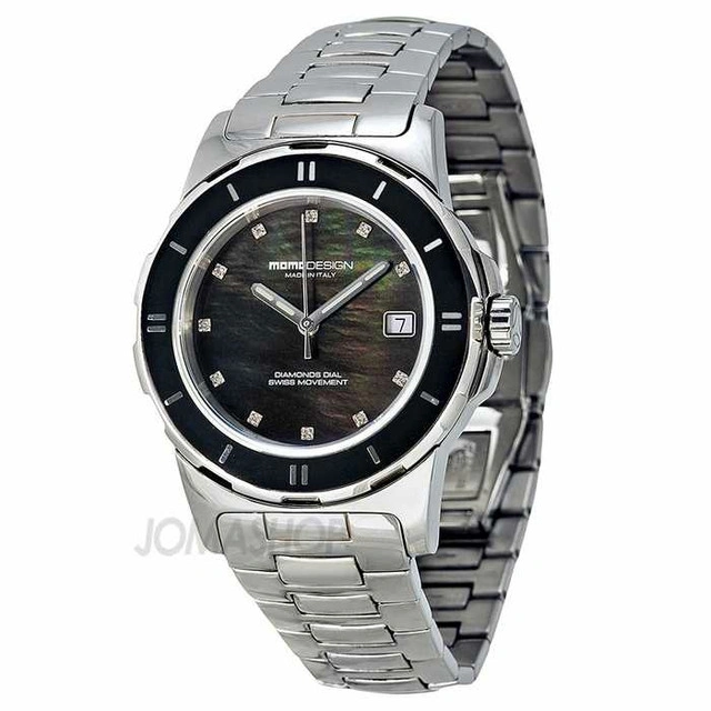 Stainless steel case with a stainless steel bracelet. Black mother of pearl dial with luminous hands and diamond hour markers. Dial Type: Analog. Luminescent hands. Date display at the 3 o'clock position. Swiss quartz movement. Scratch resistant sapphire crystal. Pull / push crown. Solid case back. Case diameter: 37 mm. Case thickness: 10 mm. Round case shape. Band length: 7 inches. Deployment with push button clasp. Water resistant at 100 meters / 330 feet. Functions: date, hour, minute, second. Dress watch style. Momo Design Black Mother of Pearl Stainless Steel Ladies Watch 093-C-MB-01BK.
