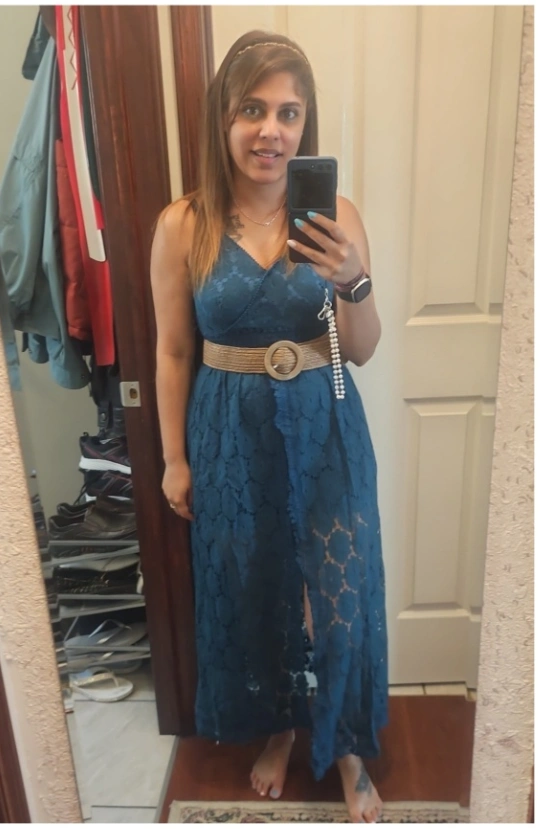 Selling a beautiful blue lace maxi dress with a V-neck and a stylish slit. It's a size medium and perfect for a special occasion or a night out. The dress has a delicate lace pattern and a flattering silhouette. Originally priced at $56.99!