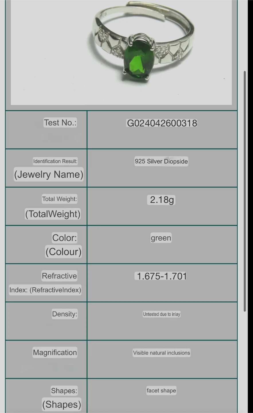 Selling a beautiful S925 silver ring featuring a natural green diopside stone. The stone has a facet shape and visible natural inclusions. The total weight is 2.18g. The ring size is adjustable and suitable for US size 6 to 8.