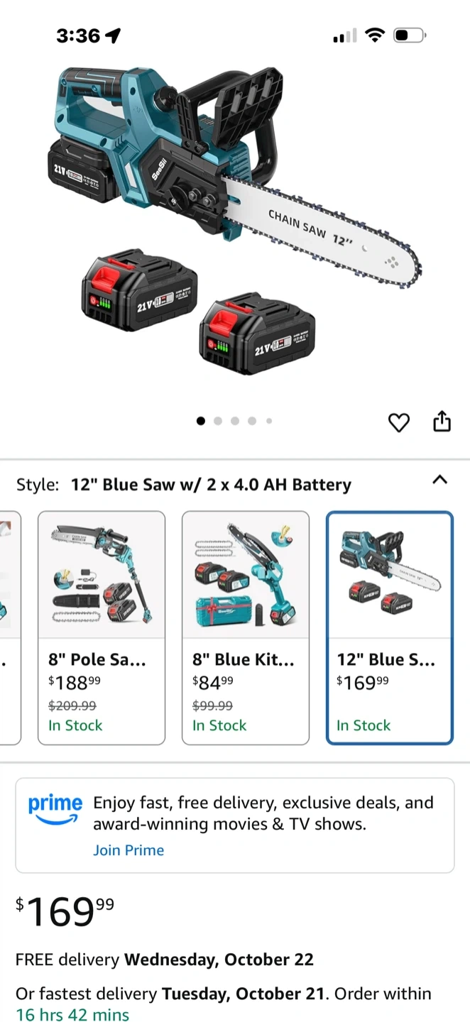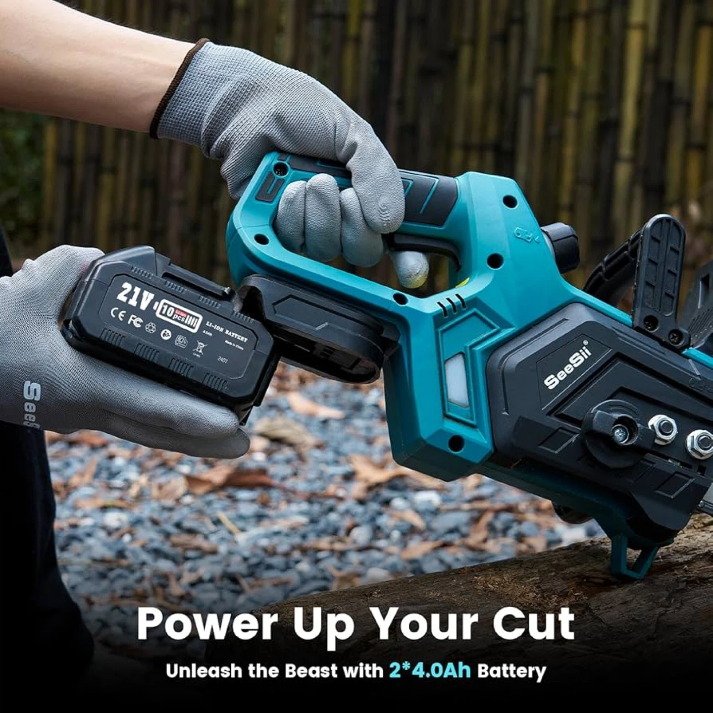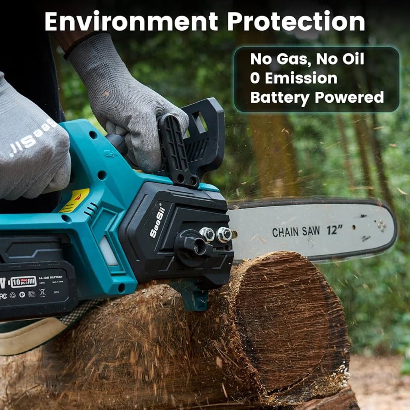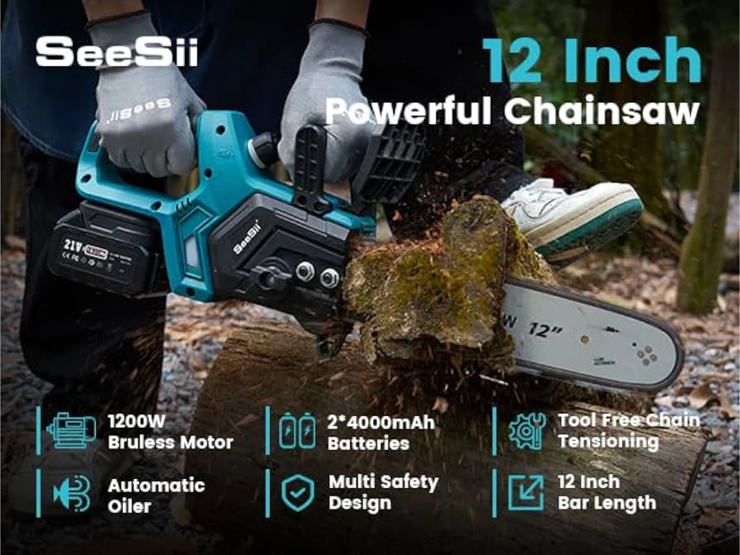 48Selling a SeeSii cordless electric chainsaw with a 12-inch blade It features: - Automatic lubrication for smooth cutting - Battery-powered, no gas or oil needed - 1200W Brushless Motor - Efficient cutting with a max cutting speed of up to 15m/s - Comes with two 4.0Ah batteries