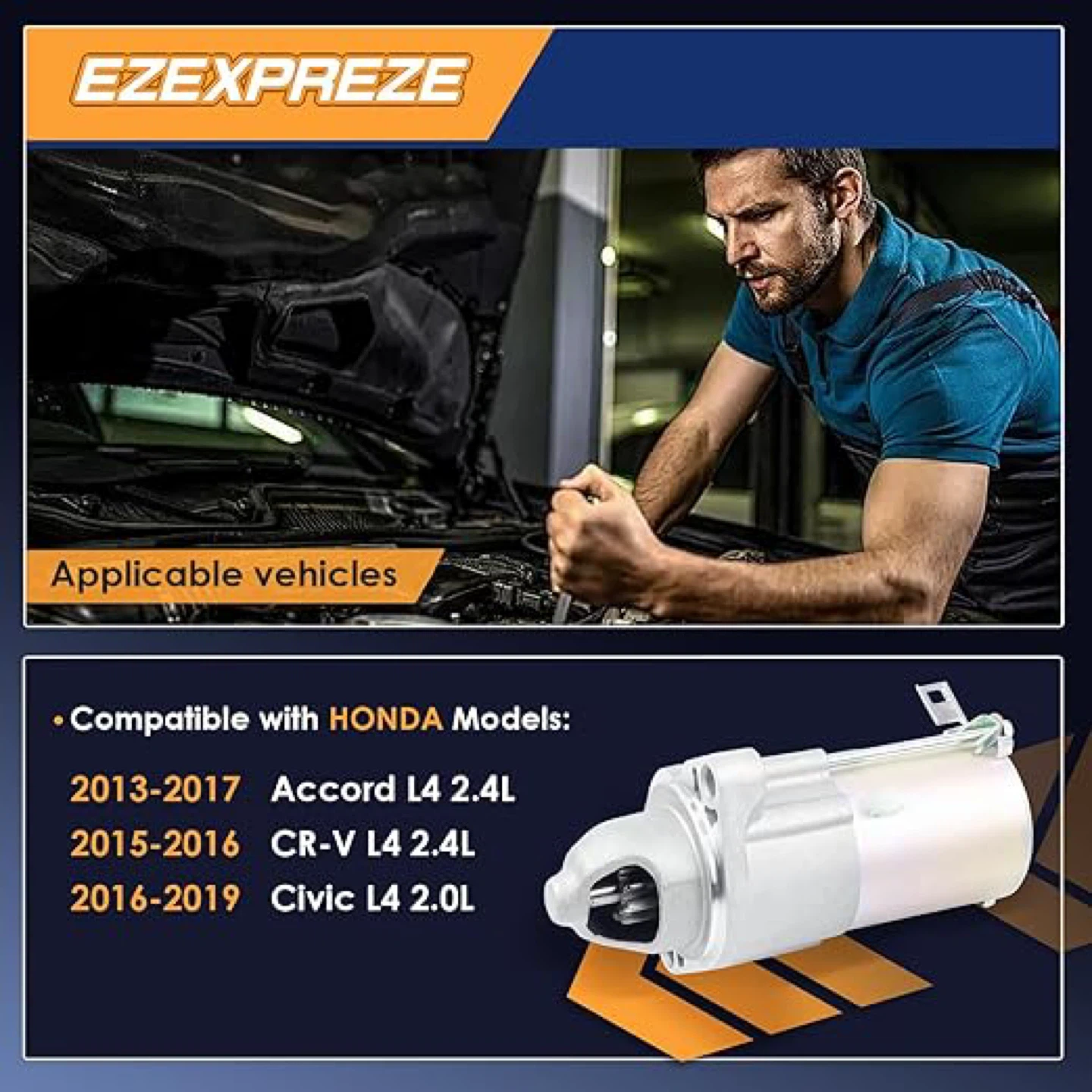 Selling an EZEAUTO starter, 100% DV tested! Compatible with Honda models: 2013-2017 Accord L4 2.4L, 2015-2016 CR-V L4 2.4L, and 2016-2019 Civic L4 2.0L