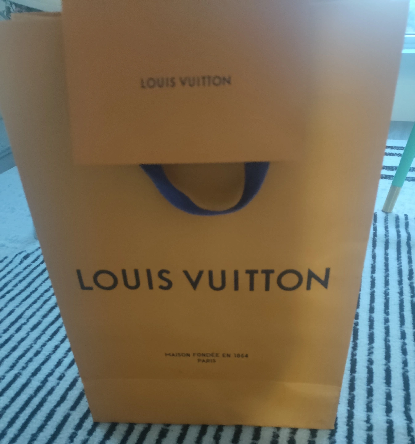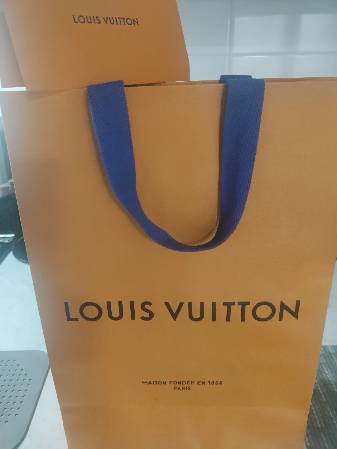 103Selling a Louis Vuitton shopping bag in excellent condition! It's a great size for carrying your items in style. The bag features the classic Louis Vuitton logo and blue handles. Originally bought for $70