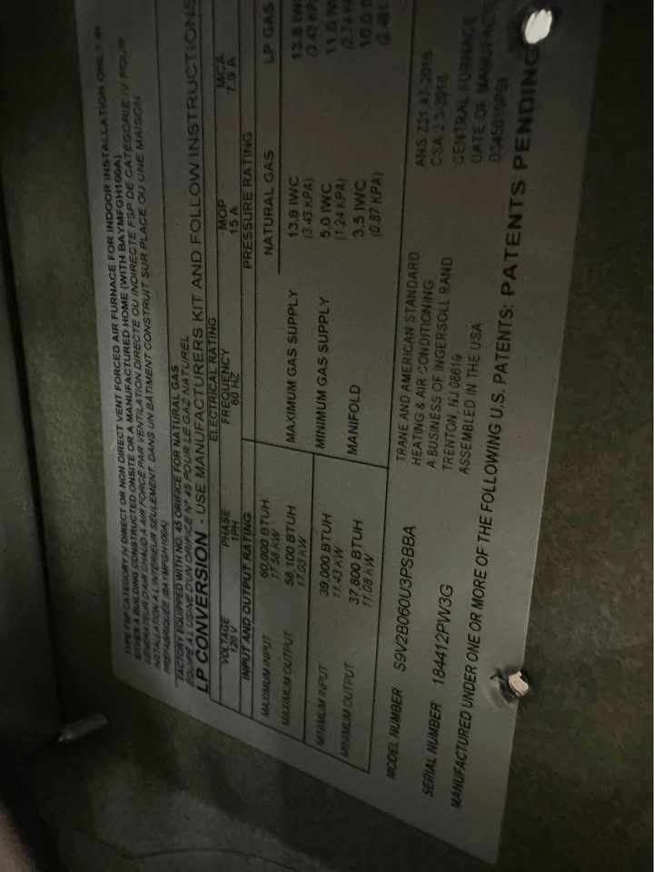 Top-quality American Standard furnace (made by Trane) in excellent condition, professionally removed from a home demolition. ✅ 60,000 BTU – efficient and reliable heating performance. ✅ Premium brand built by Trane – known for durability and quiet operation. ✅ Perfect for home replacement or garage/shop heating projects. ✅ Clean, well-maintained, and ready to install Make: American Standard (by Trane) Model: S9V2B060U3PSBBA BTU: 60,000 💨 Runs beautifully — great value for a high-end furnace at a fraction of the new price!